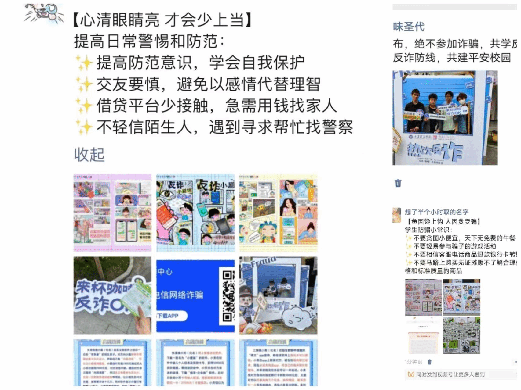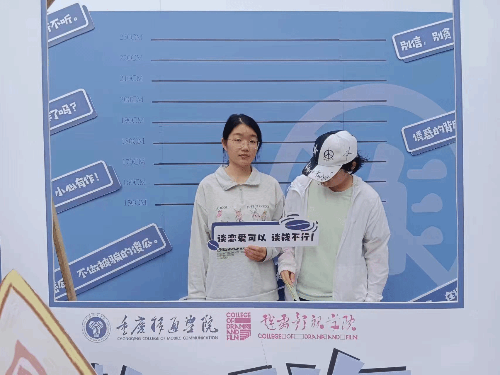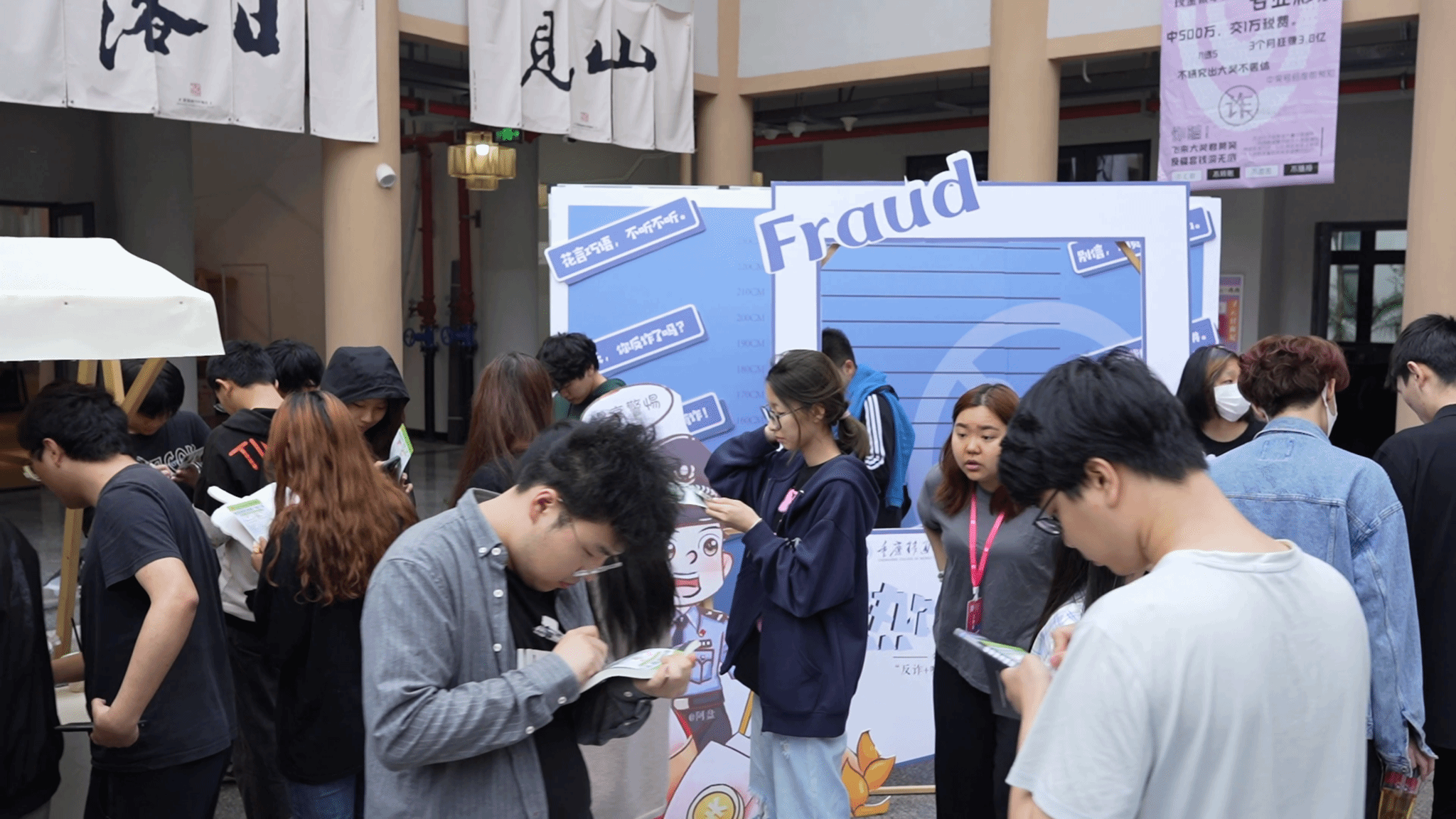 跟随活动地标的指引,同学们去向下一个打卡点,道路两旁的反诈漫画吸引了注意力。这些反诈漫画都是近期发生在大学的真实事件,工作人员用漫画的形式展示出来,时刻提醒同学们注意反诈,不要被所谓的美好诱惑,从而掉进诈骗的陷阱。