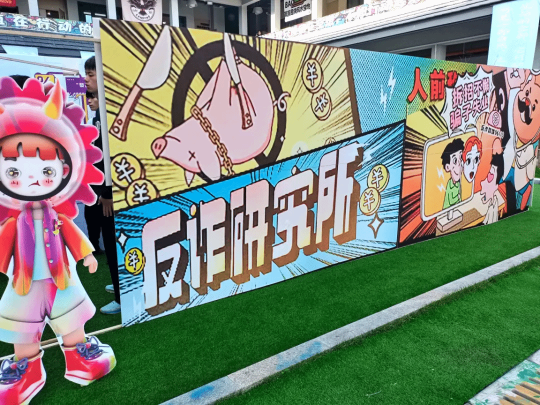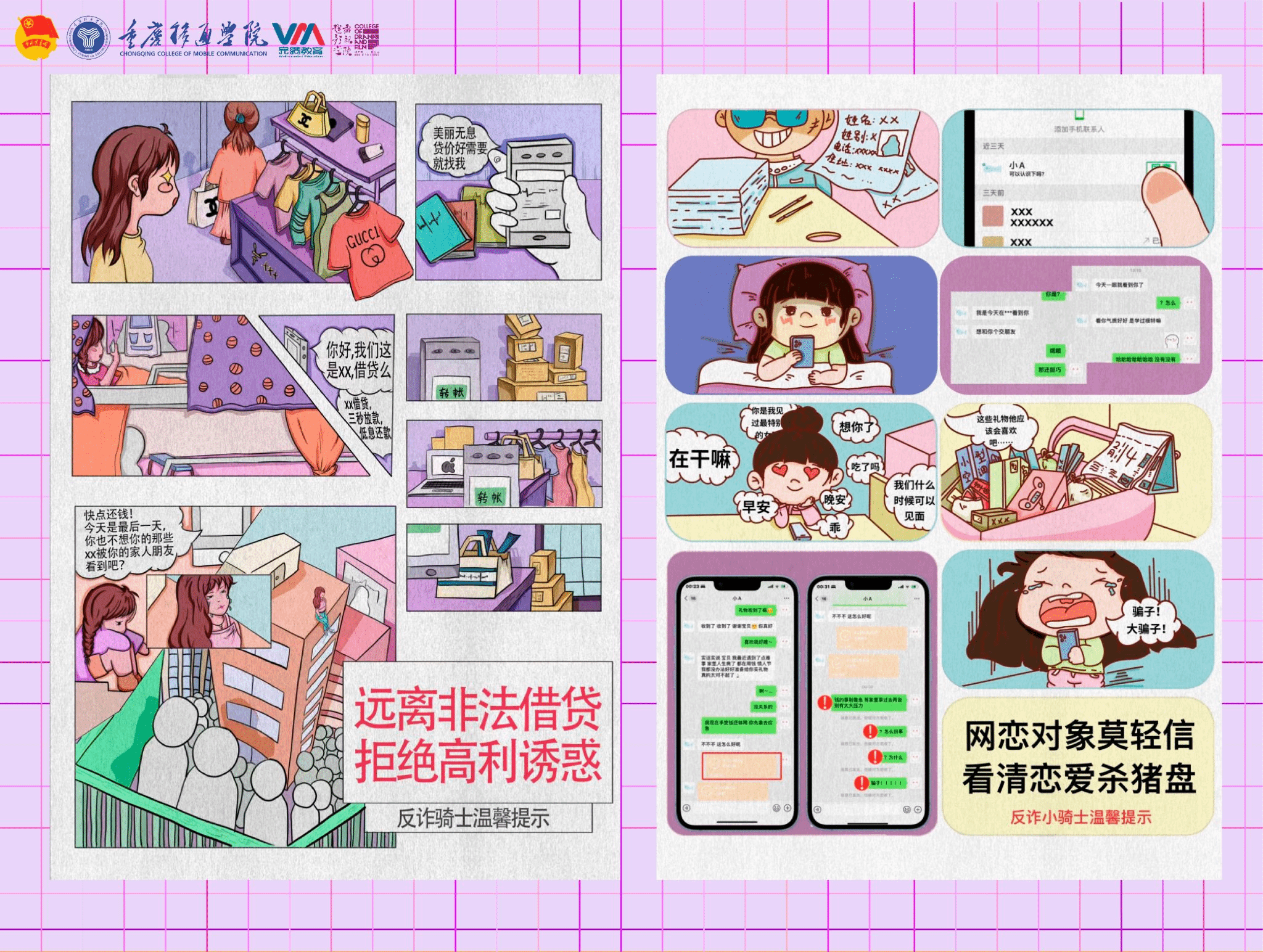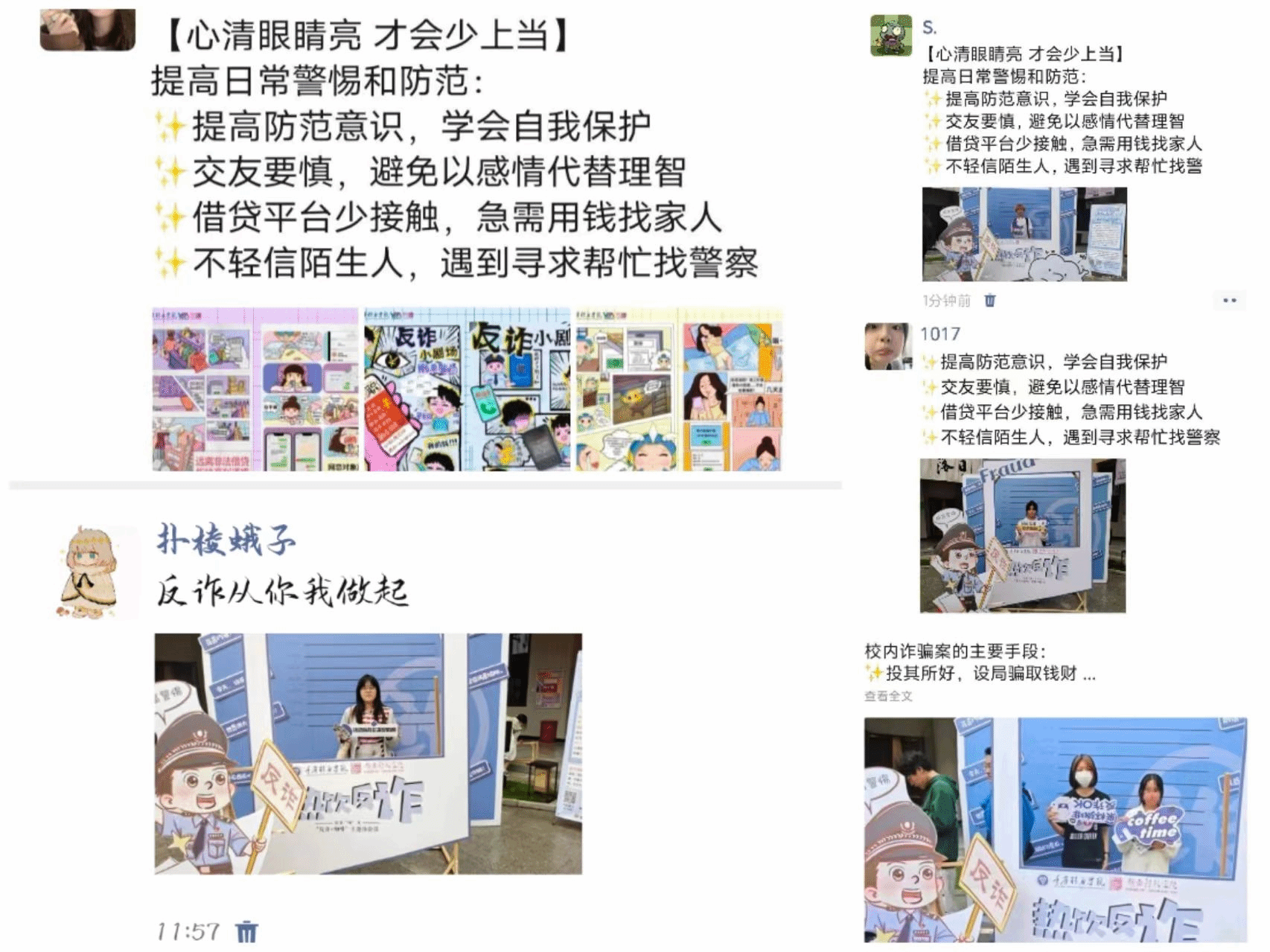 跟随活动地标的指引,同学们去向下一个打卡点,道路两旁的反诈漫画吸引了注意力。这些反诈漫画都是近期发生在大学的真实事件,工作人员用漫画的形式展示出来,时刻提醒同学们注意反诈,不要被所谓的美好诱惑,从而掉进诈骗的陷阱。