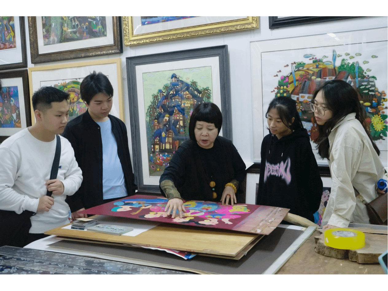 活动伊始,綦江版画院的主讲老师李成芝老师带领同学们从一楼至三楼有进行参观,向同学们讲解版画作品的创作思路和意义,在三楼版画制作工作室里,学生社团负责人近距离地观察大师制作版画时的细致入微,在这一幅幅精美的版画作品中,学生社团负责人们体验到一场艺术盛宴,更感受到那份对非遗版画的深厚情感和对生活的热爱。