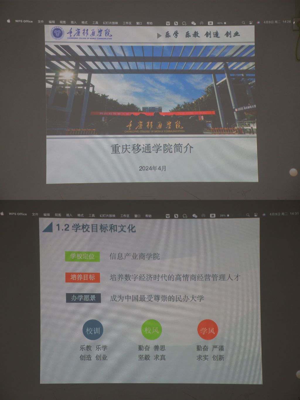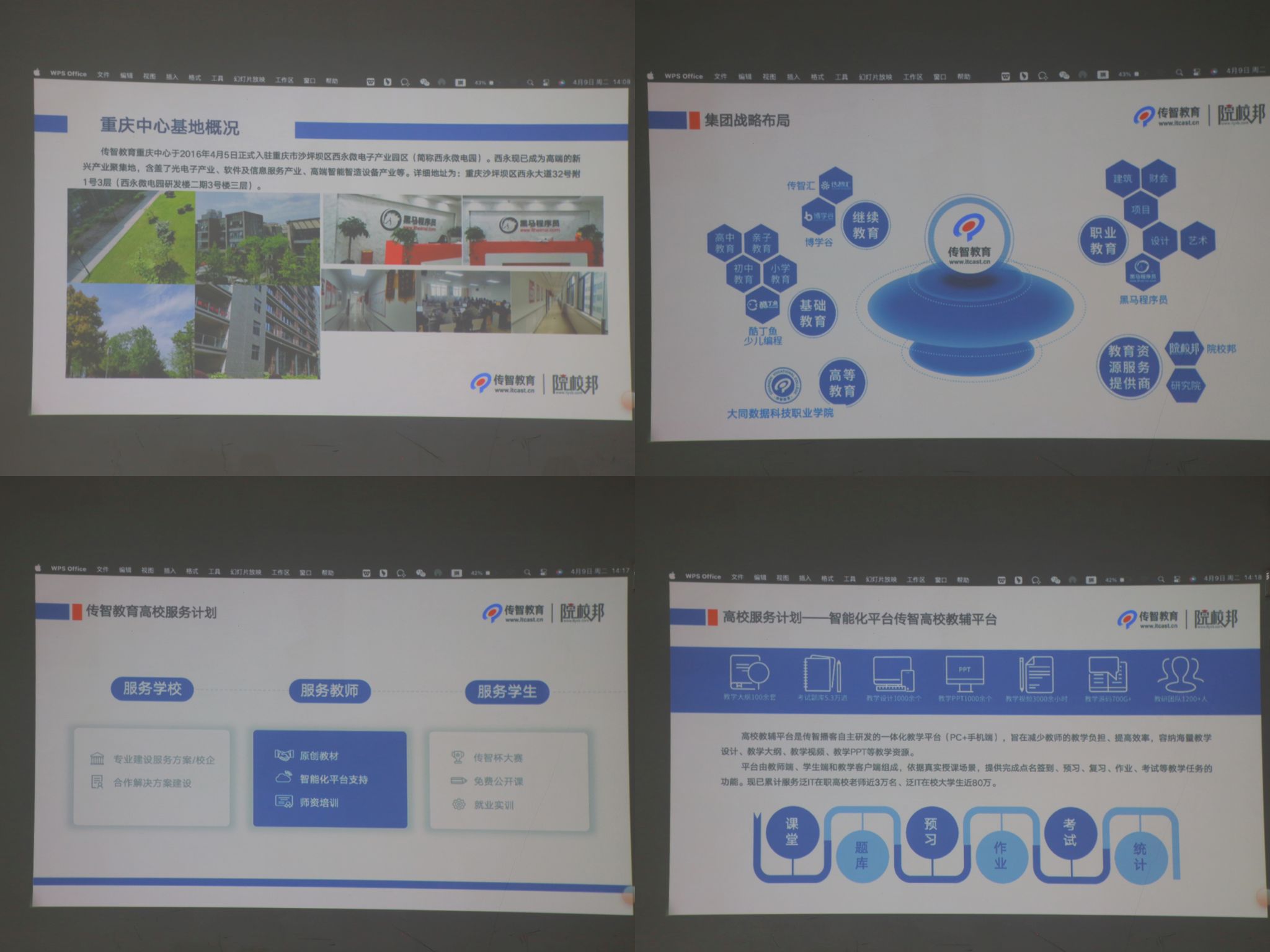 校企介绍完毕,向碧群副院长给企业的负责人们介绍了我校计算机学院的基本概况。学院有计算机科学与技术、智能科学与技术两个专业,计算机应用创新中心、ACM数据算法创新中心和智能创新中心三个创新中心。我院作为第十五届蓝桥杯全国软件与信息技术专业人才大赛省赛重庆移通学院赛点,未来可以与公司在“传智杯”的开展上合作,也为洽谈后续具体合作事项做好了铺垫。