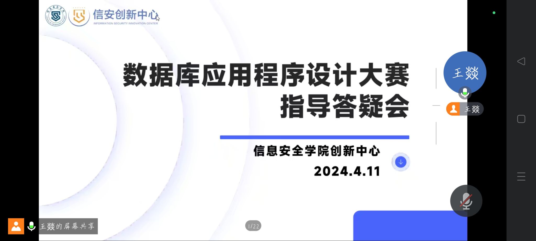 为了更好地推进我校“第六届数据库应用程序设计大赛”的顺利进行,提高参赛作品的质量和水平,选拔出更优秀的作品代表学校参加市赛,从而进一步展现我校在该领域的教学成果。信息安全学院创新中心于4月13日晚上20时30分,在腾讯会议举办了“数据库应用程序设计大赛线上指导答疑活动”。本次活动由信安创新中心总负责人王燚老师主持并主讲,特别邀请了互联网创新中心20级负责人、第五届重庆市数据库应用程序设计大赛省奖获得者——宋志豪同学作经验分析。来自信息安全学院、计算机学院、大数据学院、双体精英产业学院等部门的90多位参赛选手及部分指导教师参加了此次活动。