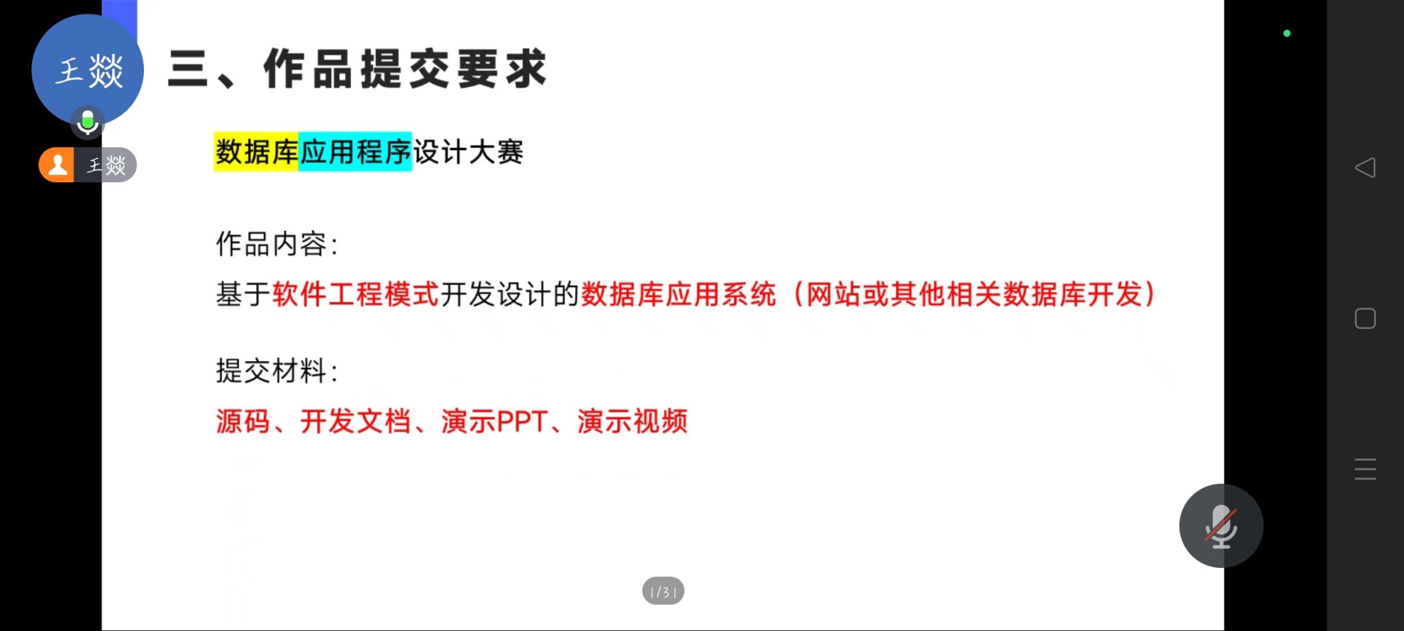 首先,王燚老师向大家介绍了信息安全学院创新中心的工作和文化。接着,他从大赛简介、评分标准、奖项设置、作品提交四个方面,详细地为各位参赛选手讲解了本次大赛的核心要点和注意事项。王燚老师强调,本次大赛旨在通过实践锻炼,提升同学们的数据库应用设计与开发能力,希望同学们能够深入理解大赛的评分标准,从设计思路、技术创新、实际应用、文档规范等多个维度进行作品的设计和制作,以确保作品能够脱颖而出。