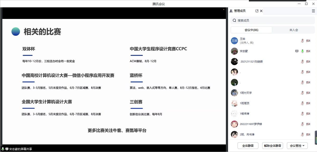 随后,宋志豪同学作为上一届大赛的获奖者,分享了自己参赛的经验和心得。他详细讲述了自己在作品设计、开发、调试以及提交过程中的经历,强调了团队搭配、团队合作、时间管理以及技术攻关的重要性。宋志豪同学的分享让在场的师生们受益匪浅,对即将参赛的同学们起到了积极的引导和激励作用。