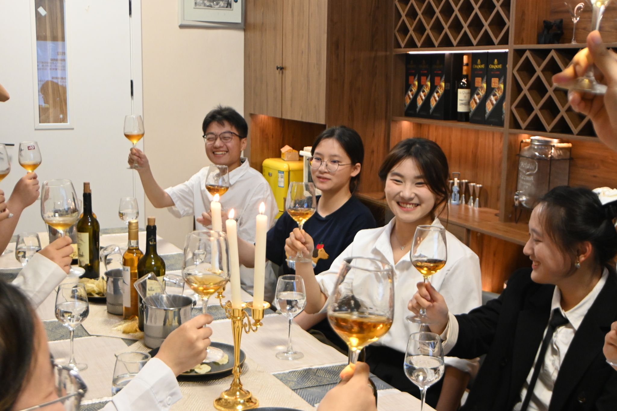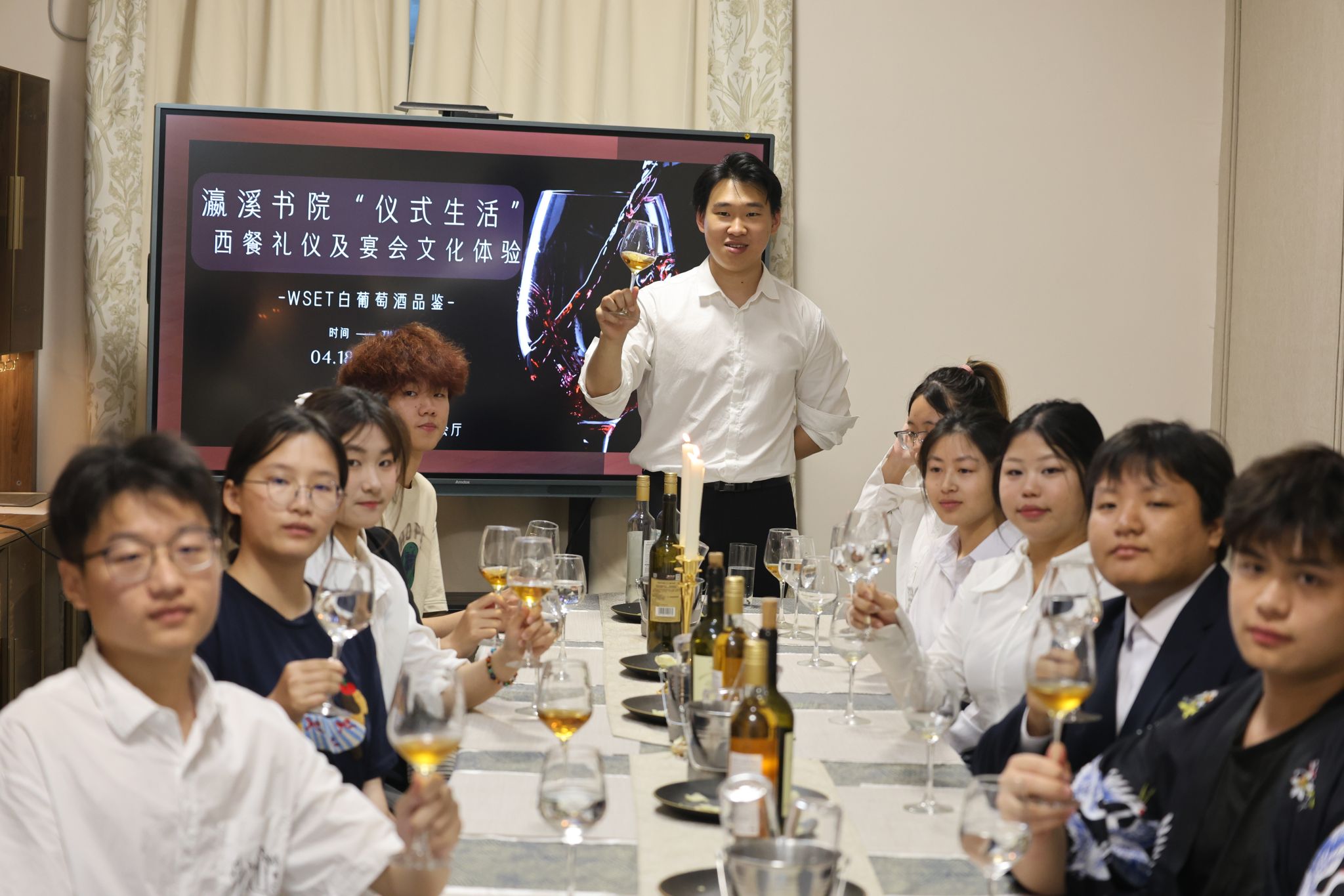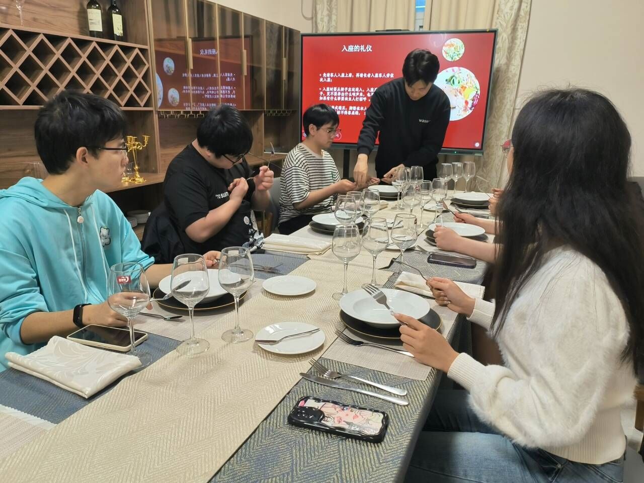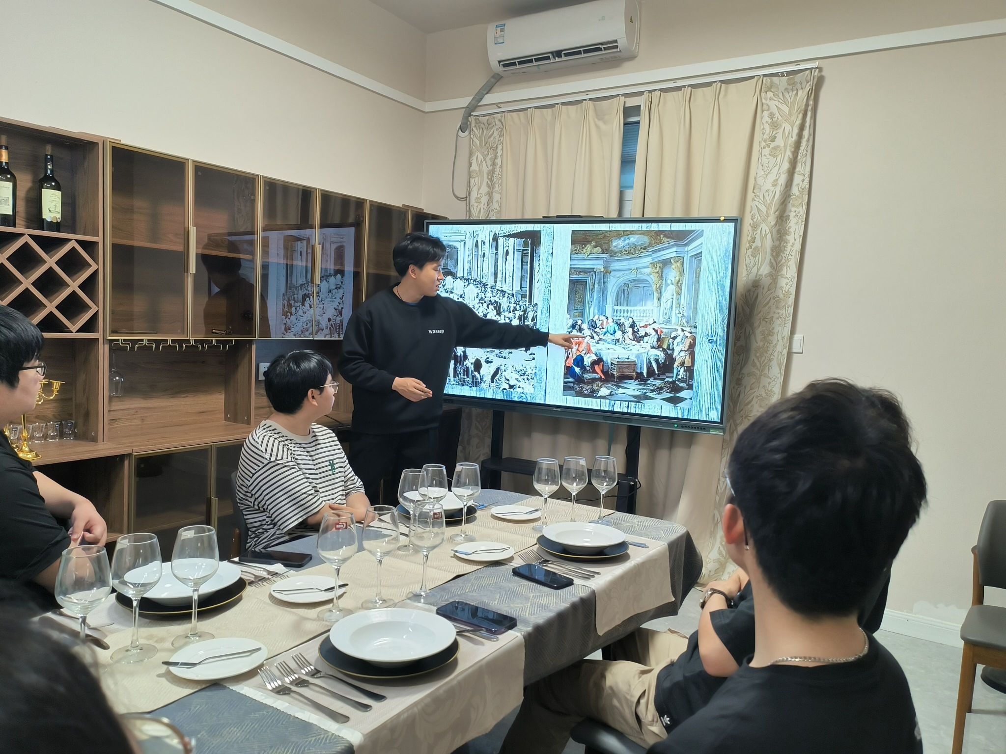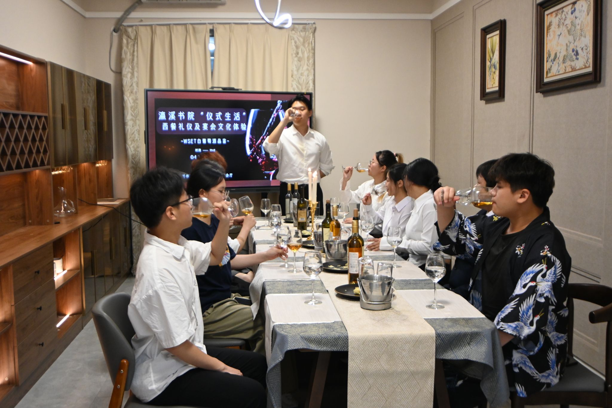 精致的红酒杯照映着跳跃的烛光,笔直的桌旗盘桓于长桌之上;醇香馥郁的葡萄酒和明镜般闪亮的刀叉,在壁灯的光芒下更显优雅。为践行瀛溪书院家文化培养体系,打造“仪式生活”特色活动,促进书院品牌活动可持续运营。瀛溪书院分别于4月9日和18日,在瀛溪书院二号楼YX208私人宴会厅开展了两期“礼仪生活,典雅盛宴”---西餐礼仪与宴会文化体验活动。两期活动的主题分别为“餐桌礼仪及宴会文化体验”和“葡萄酒珍酿品鉴”。在私人宴会厅的精心布置下,在典雅舒缓的氛围中,品味精致美食,学习和体验西式宴会礼仪与社交技巧,赋予生活更多“仪式感”。