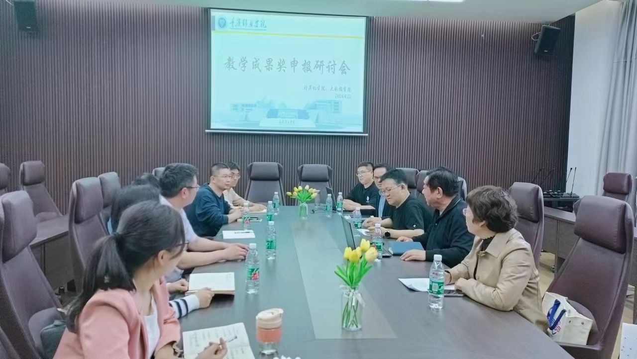 为进一步提升我校教育教学成果的质量和水平,推动教育教学创新,且助力计算机学院和大数据学院两院成功申报重庆市教学成果奖,双院联动特邀陈立潮教授和王龙院长于2024年4月22日在横山书院九四会议室指导教学成果奖申报工作。