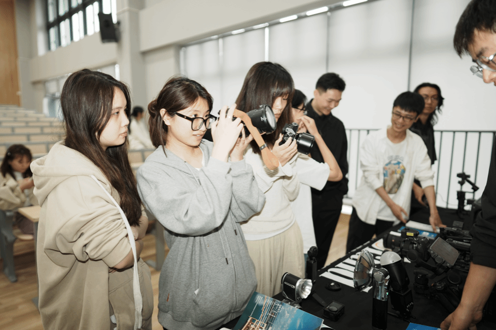 在巡讲团老师们的引导下,同学们个个跃跃欲试,积极地参与到了拍摄当中。老师们根据每位同学的情况,耐心地指导同学们如何选择合适的拍摄角度。在互动环节,同学们也都踊跃提问,“如何才能在有限的空间中拍出创意”“怎么才能够跟模特有效沟通,使人像作品更加自然”,面对同学们求知若渴的目光,巡讲团的老师拿起现场的设备,在演示中为同学们一一解答。