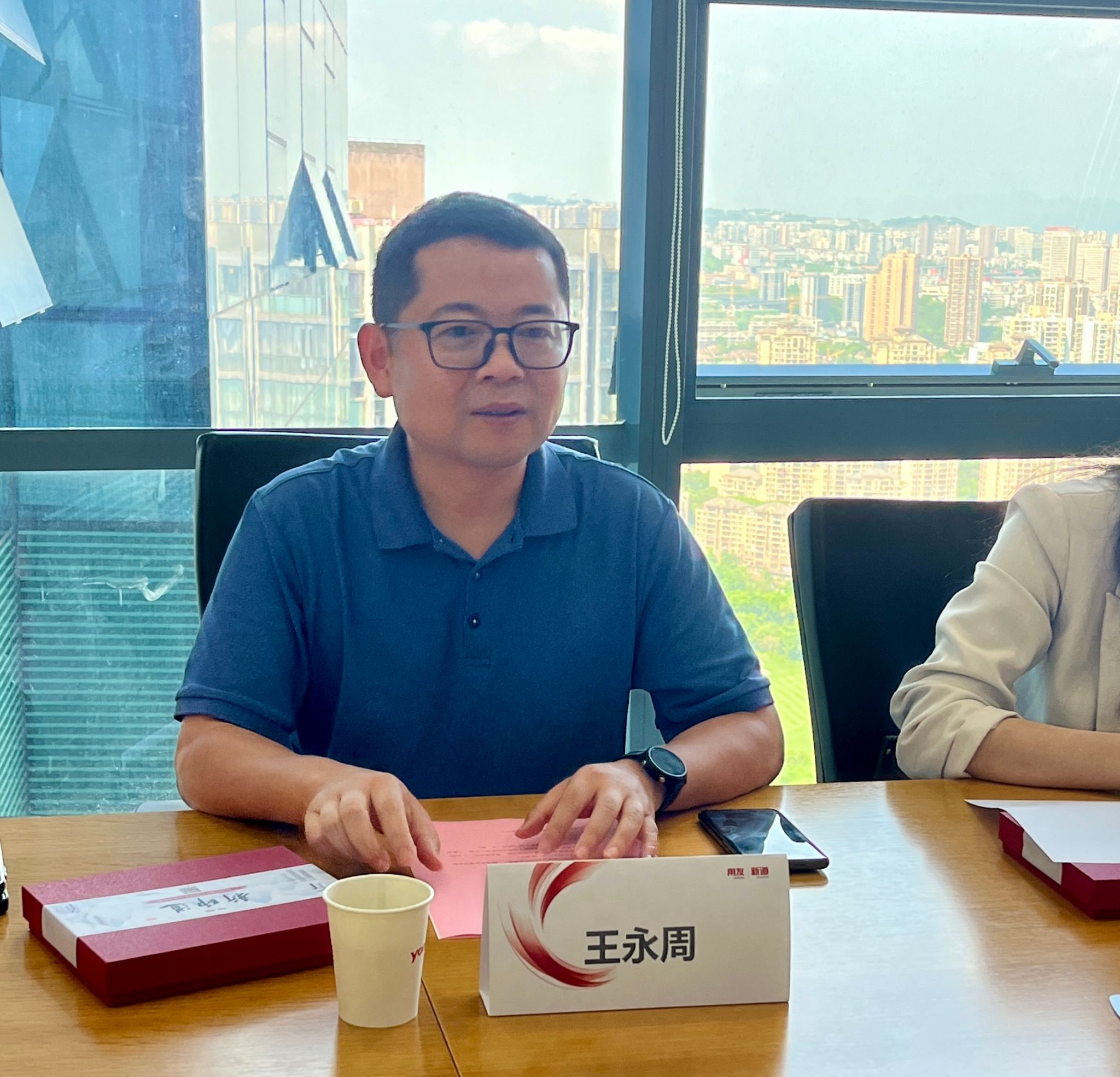 用友新道科技股份有限公司重庆分公司总经理徐福年、高级教育规划顾问谷彬、服务总监李志良、校企合作经理印灿热情接待了王永周一行人。在徐福年总经理的带领下,王永周一行人参观了公司的办公环境,徐福年围绕企业经营理念、业务范围、人才需求以及用友集团和新道科技近年的发展情况。