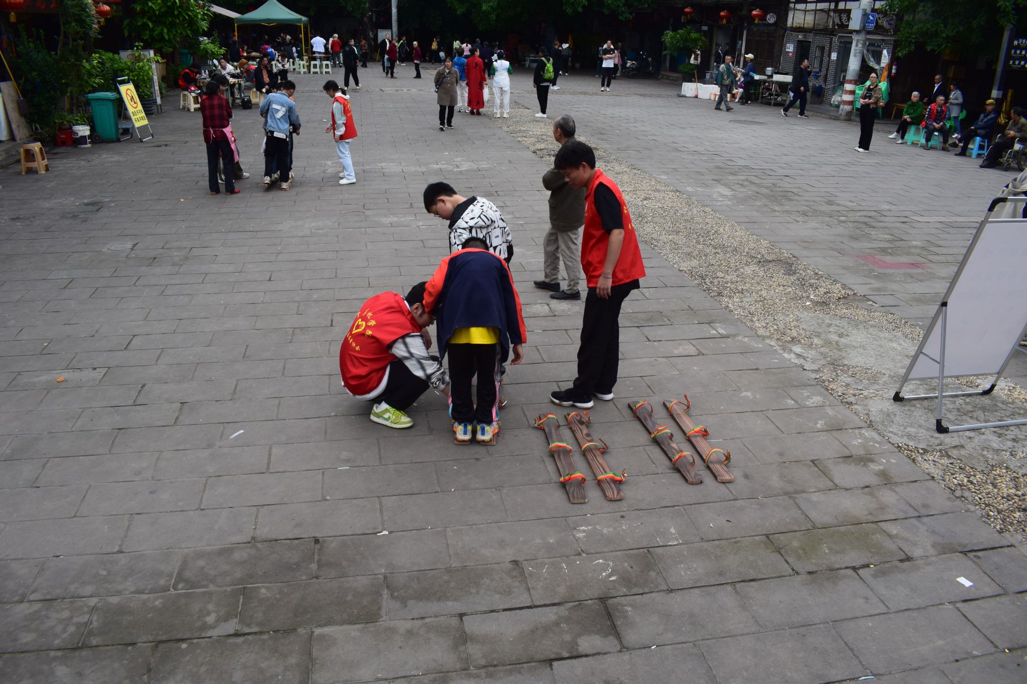 志愿者们在活动中充当了引导员和参与者的双重角色,在万寿宫广场上,他们用热情和耐心向游客介绍活动的玩法,并亲自示范竹竿舞、板鞋的玩法,让到来的游客们感受到了当地民族运动的乐趣。