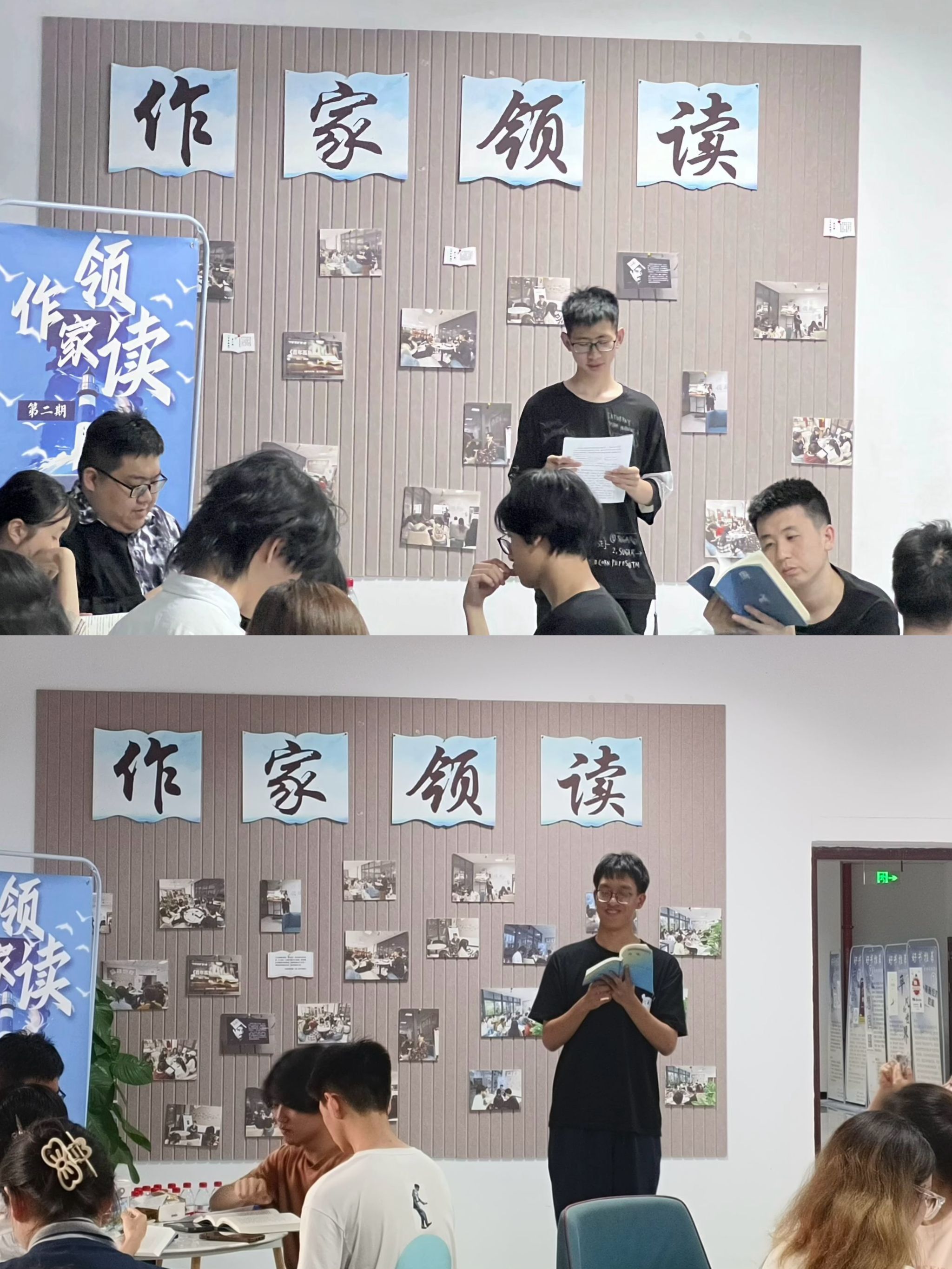 四次的领读活动,分别安排了四位领读学生做章节分析,领读的同学也会收到徐老师精心准备的礼品,以作奖励。张福建同学在领读时说到,“《围城》第一章讲述了主人公方鸿渐的个人背景和早期经历,描绘主人公方鸿渐在船上的生活和与其他人物的互动,为整部小说设定了基调。”领读同学汪勃帆则谈到了第四章:“《围城》第四章在全文中起到承上启下的作用,过渡了方鸿渐与几位姑娘的纠缠,承接出后文前往三闾大学教书,自然地完成了场景转换,顺便还交代介绍了方鸿渐的家庭情况。”。