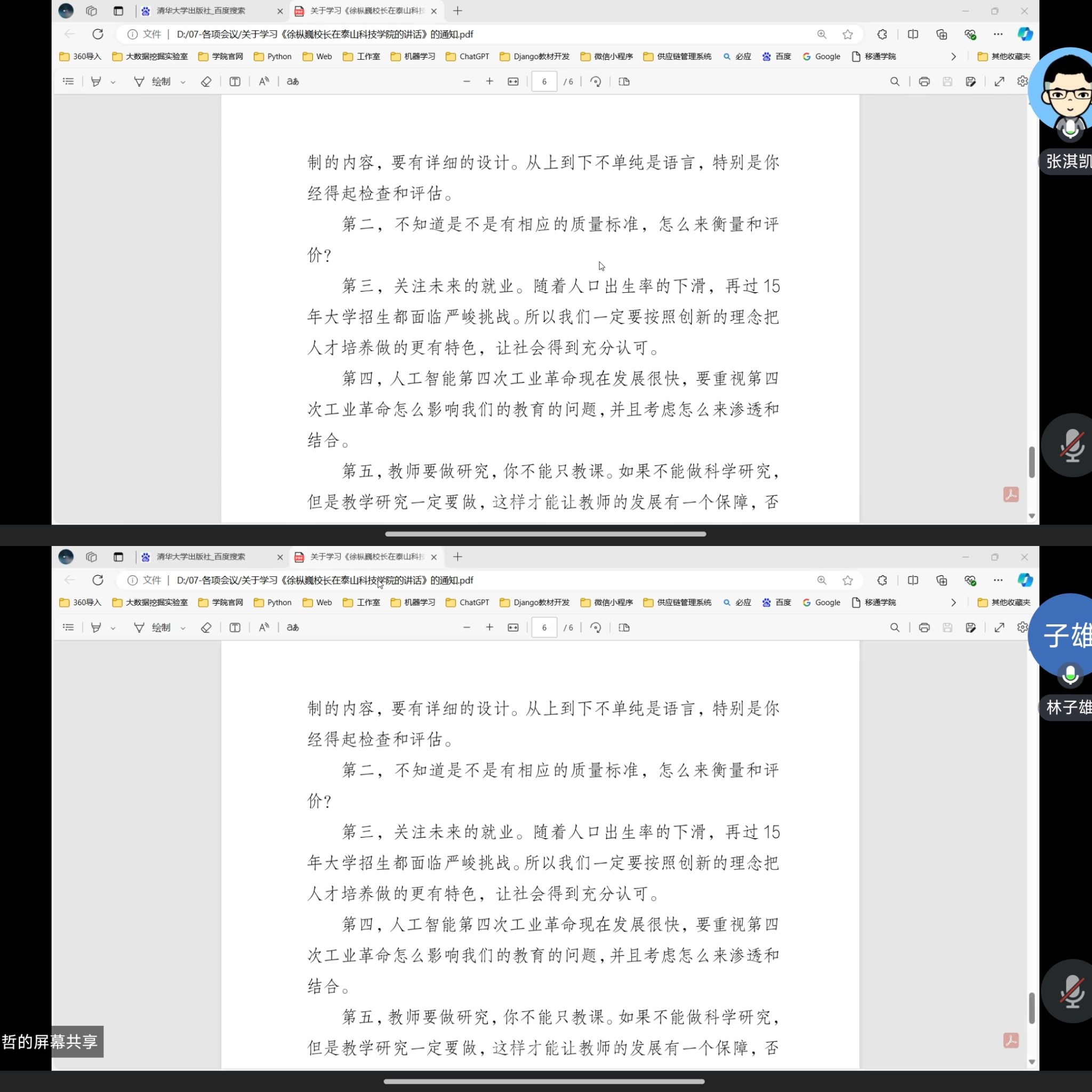 随后老师们也积极分享了自己的学习感悟,罗稚琪、李倩、林子雄、张淇凯等四位老师分别从教育理念的创新、教育特色的发展以及个人未来努力的方向做了交流发言。老师们都认识到教育的全面性、前瞻性,以及在人工智能时代下教育方法的调整,承诺将讲话精神融入日常教育工作,通过具体行动促进学生的全面发展,提升教育质量,培养适应未来社会需求的优秀人才。