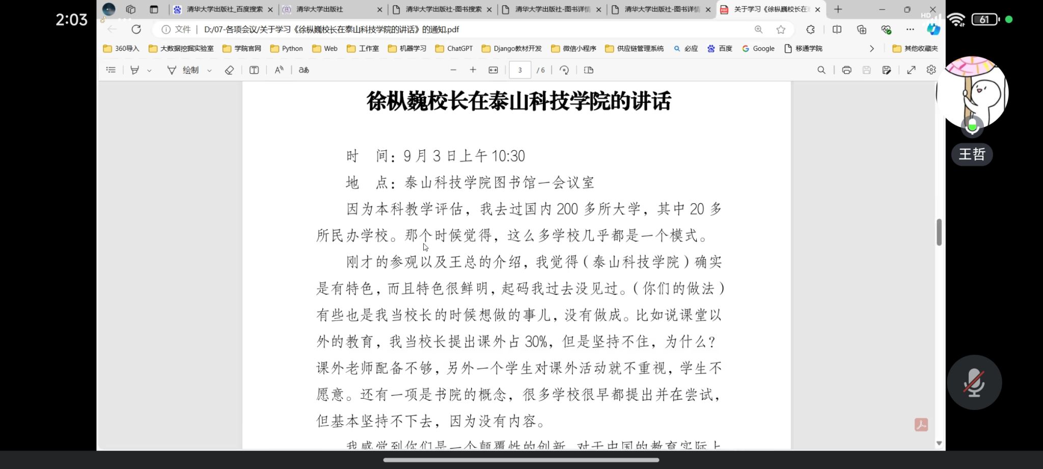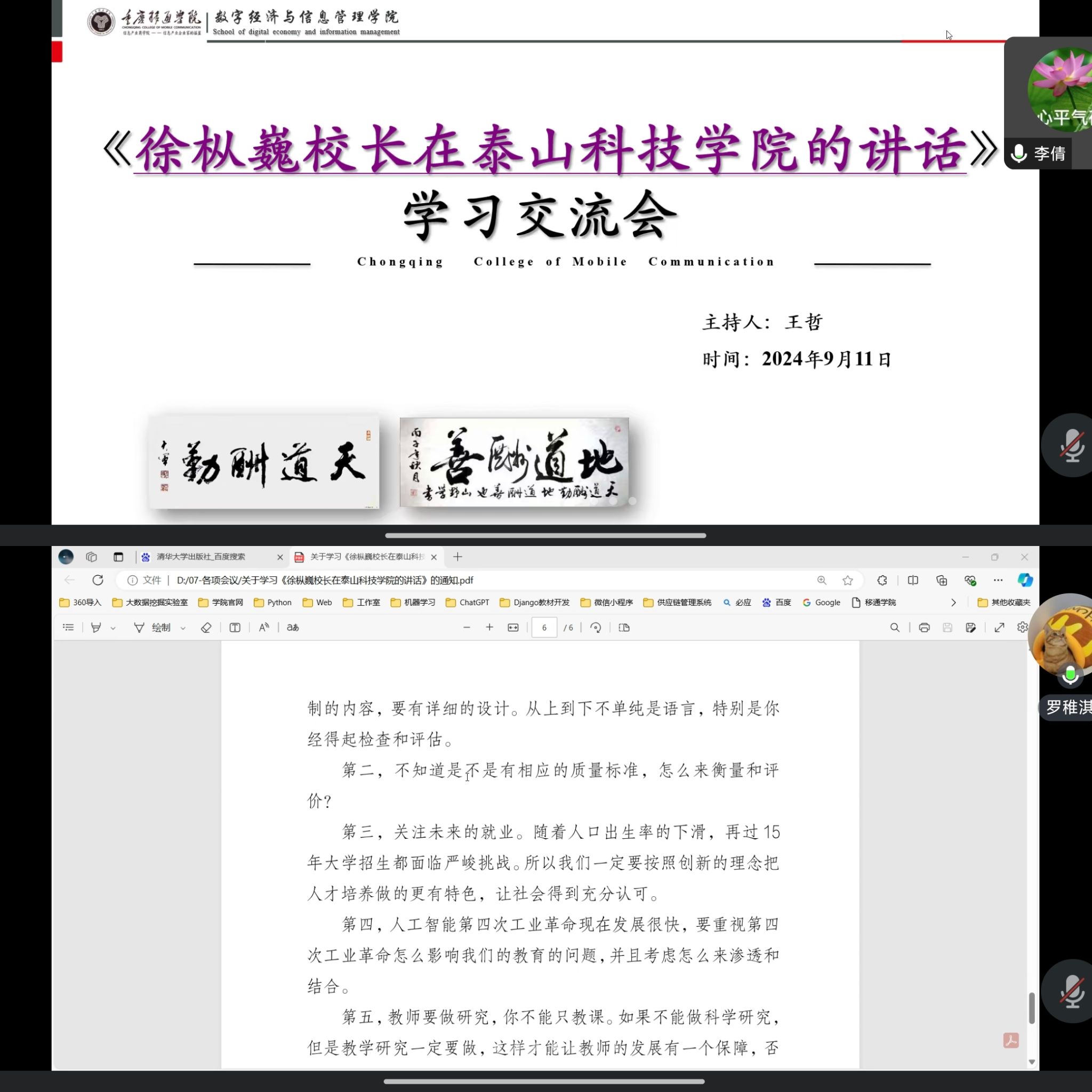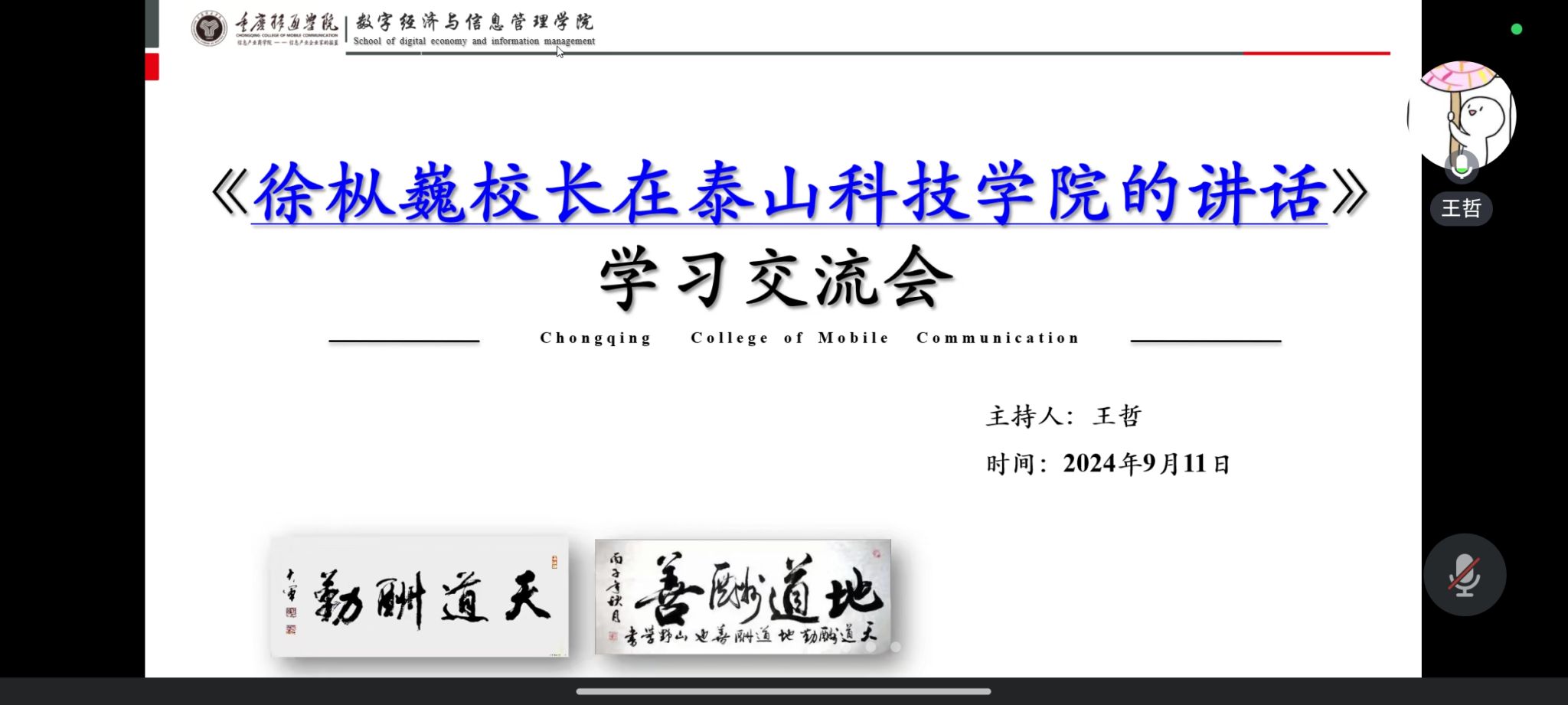 为进一步推动学院教职工对“四位一体双院制+特色课程”人才培养模式的理解,深刻理解致力于未来成为“双一流之外的首选大学”的办学目标,数字经济与信息管理学院开展了线下自学线上集中学习等形式多样的学习活动。2024年9月11日学院在腾讯会议上展开了《关于徐枞巍校长在泰山科技学院讲话》的集中学习会,由王哲副院长主持,学院全体教职工参加了学习。