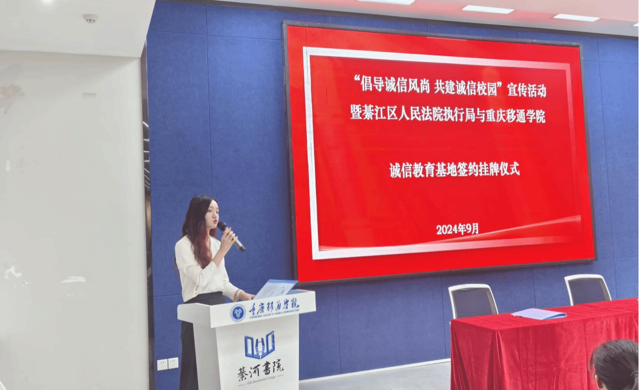 推动法治教育与诚信建设:借助法治教育基地和诚信建设基地的签约仪式,促进法治文化的传播,提升师生的法治素养和诚信品质。由重庆移通学院领导致欢迎词,綦江区人民法院执行局领导发表讲话。活动通过举办专题讲座、案例分享、模拟法庭、诚信宣誓等形式多样的形式,让同学们近距离感受法律的威严与诚信的力量,激发他们自觉践行诚信规范的内在动力。