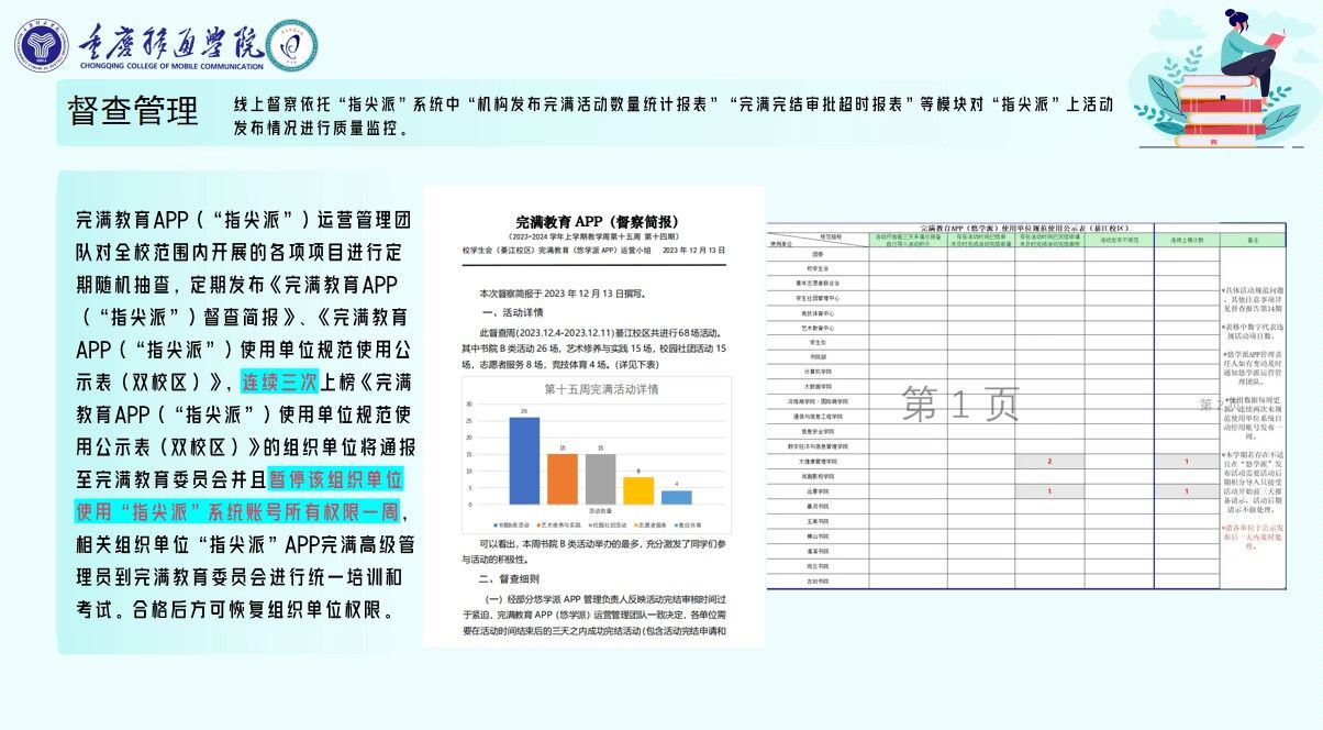 在充满“改变”的9月,完满教育学分修读软件“指尖派”全新上线,校学生会以“指尖派”为抓手,依托《“指尖派”管理办法》《完满教育学分实施管理办法》《“指尖派”小程序宣讲》三个内容, 9月13日—27日陆续开展第一阶段使用单位教师培训工作、新生完满教育学分解读宣讲以及各使用单位学生管理运营团队关于指尖派管理办法解读及使用培训,达到教师学生100%覆盖。