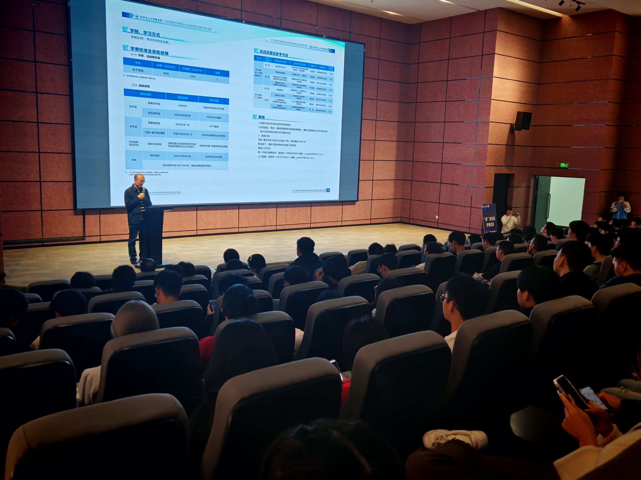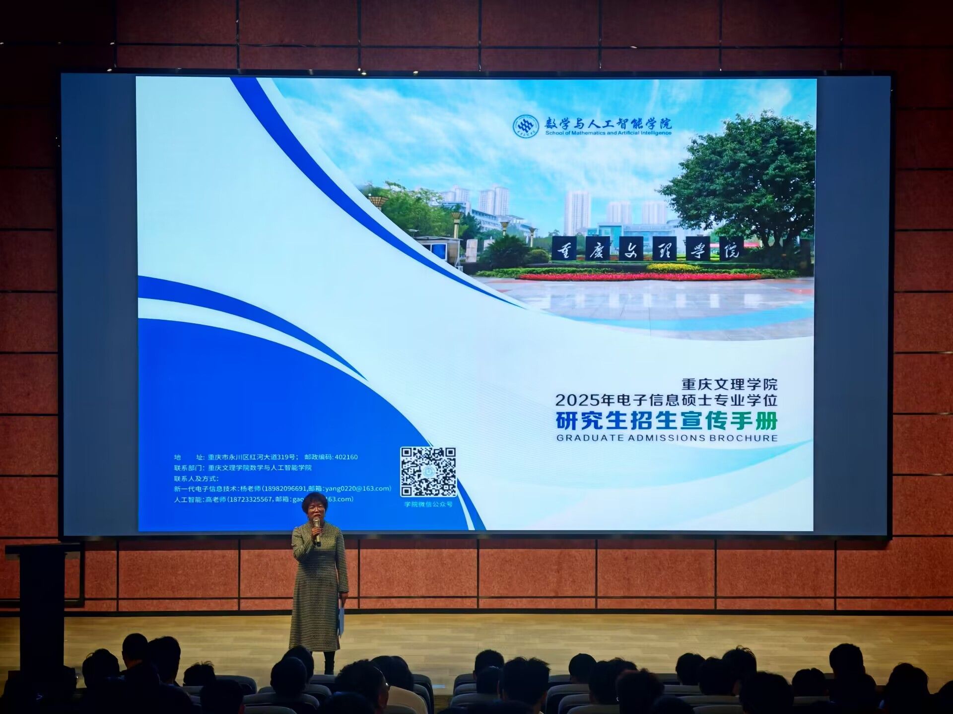 随后重庆文理学院的高峰老师向在场的师生们介绍了重庆文理学院的学位点、师资力量、学科科研平台、学科研究与应用、学制学习方式、奖助政策等情况,展示了学校在培养高层次人才方面的独特优势。他表示,重庆文理学院一直致力于为学生提供优质的教育资源和全面的发展平台,希望更多的学生能够选择重庆文理学院作为自己的考研目标院校。