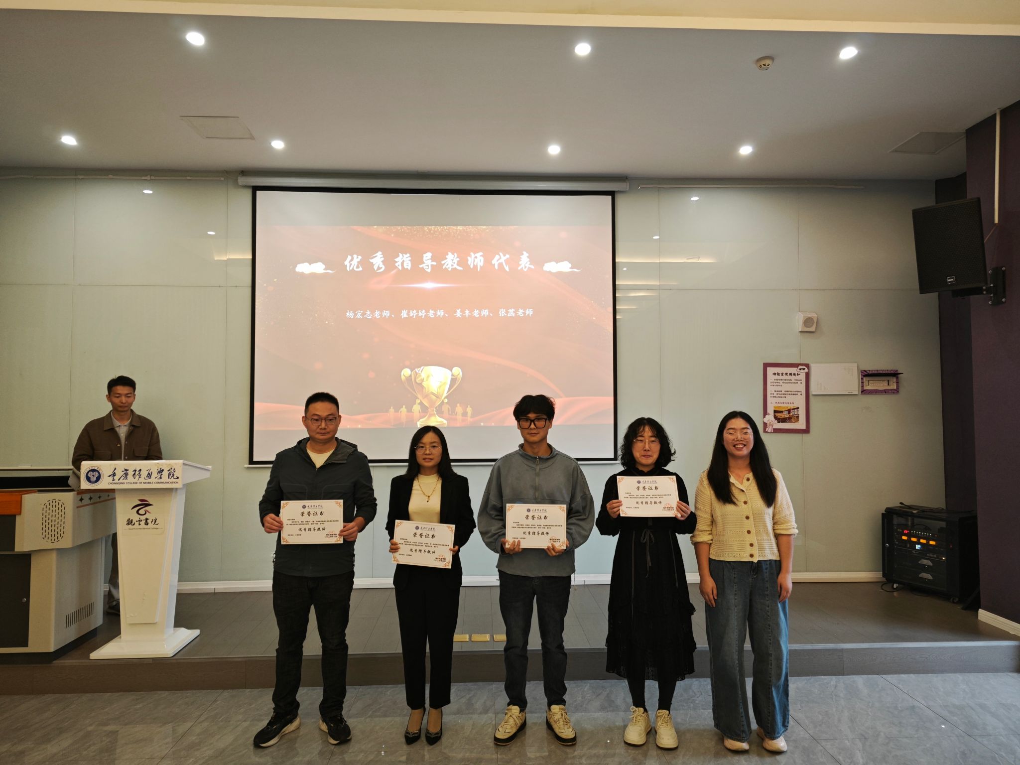 随着激昂且隆重的音乐声响起,获奖学生按奖项等级逐一登台,接受属于他们的荣誉。从优秀奖到三等奖、二等奖,再到令人瞩目的一等奖,每一次颁奖都伴随着热烈的掌声与欢呼,这是对他们辛勤付出和创新精神最真挚的赞誉和肯定。每一次名字的宣读都激起现场观众的热烈反响,为获奖者献上最热烈的祝贺。同时,为了表达对那些在幕后默默耕耘、无私奉献的教师们的深深敬意,本次大赛特别设立了“优秀指导教师奖”。这一奖项不仅是对他们智慧与辛勤付出的认可,更是向这些引领学生前行的导师们致以最崇高的敬意,以表彰他们为学生们的成长之路所做出的卓越贡献。