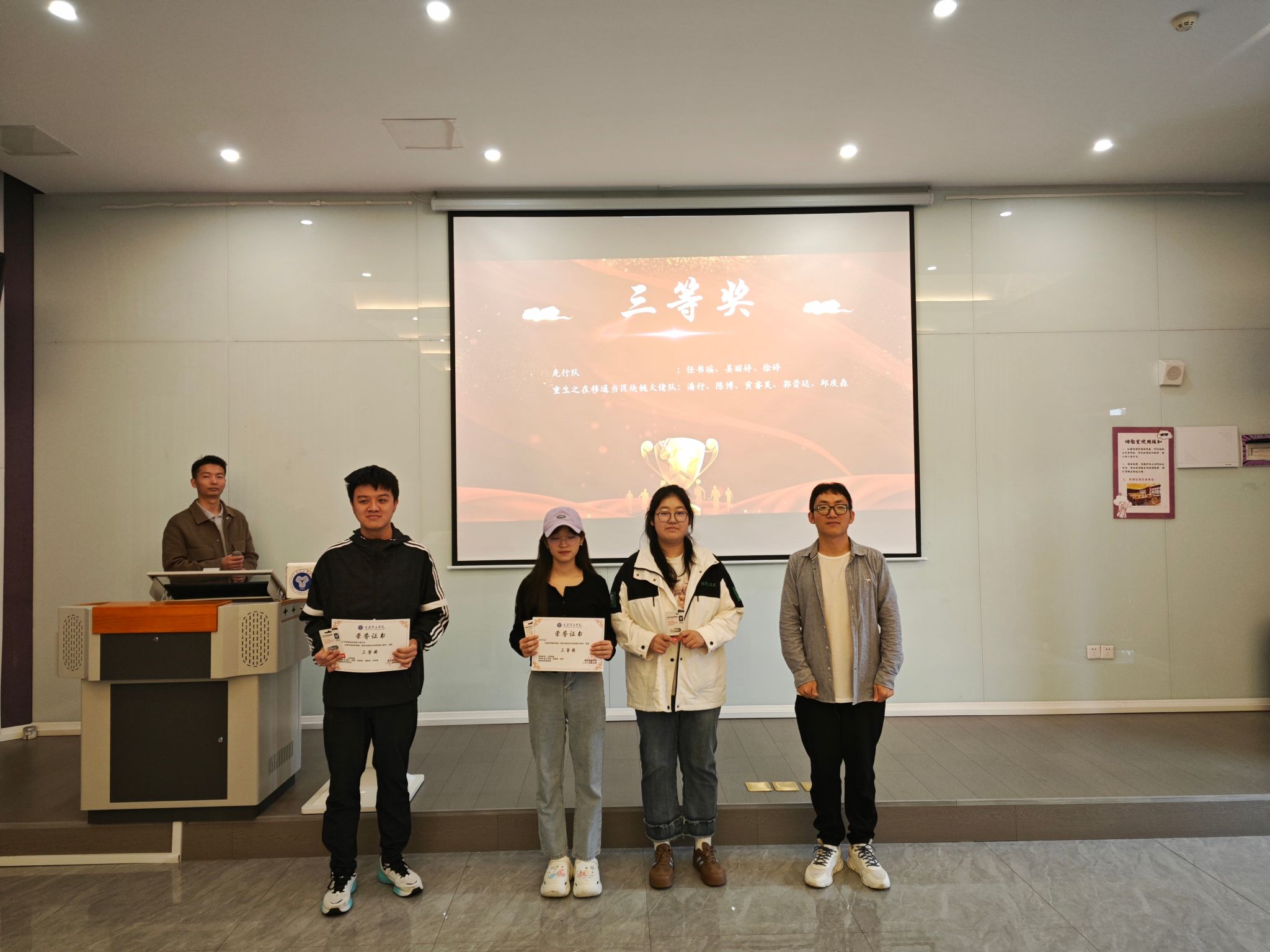 为提高我校大学生的区块链技术以及金融创新应用能力,进一步落实学校培养应用型人才的目标要求,促进我校学生的学习交流,丰富学生的第二课堂,培养学生的综合素质和实践创新能力,信息安全学院于2024年10月11日中午12时30分,在观云书院——冬至·多媒体活动室隆重举办了重庆移通学院第一届区块链技术应用创新大赛颁奖典礼。此次颁奖典礼不仅是对在比赛中展现出卓越项目开发能力和创新思维的学生们进行表彰,更是对辛勤付出的优秀指导教师的肯定。重庆移通学院信息安全学院院长王宁、代理教学副院长周小艳、网络工程教研室主任黄海军、信息基础教研室主任杨宏志以及数字经济与信息管理学院信息管理教研室主任文豪、骨干教师王红堂等嘉宾莅临现场,与参赛学生、优秀指导教师代表以及各学院的师生代表共同见证了这一荣耀时刻。