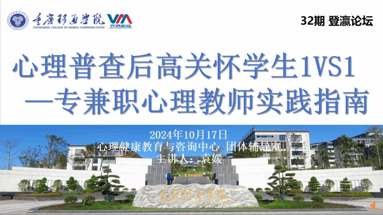 为维护校园心理安全稳定,增进心理团队建设,更有效地、高效地守护学生们的身心健康,10月17日14:30,由学生处主办,心理健康教育与咨询中心承办登瀛论坛32期“心理普查后高关怀1VS1-专兼职心理教师实践指南”培训,在心理健康教育与咨询中心团体辅导室举行。本次活动由重庆市精神卫生中心康复科主任袁媛副主任医师主讲,全体专兼职心理教师、学院心理专项岗老师参加。会议由心理中心副主任林红老师主持。
