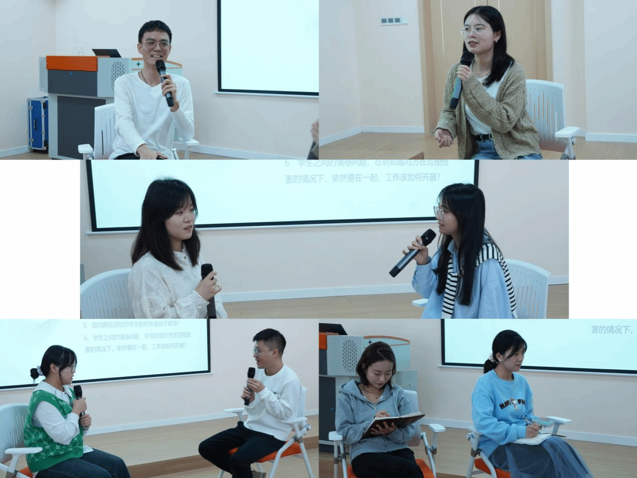 问题讨论环节,袁医生针对六个学校心理工作中的疑难问题,采取分组讨论与抢话筒话题自选的方式进行解答,提高在座心理教师的参与热情与积极性。各小组以情景再现的方式还原“心理工作困境”,老师们群策群力,共同分享各自的真实经验和感想,相互学习特殊情境下的心理工作注意事项。袁医生就老师们工作中遇到的针对心理辅导工作的开展,从来了解访者的生物心理遗传、养育特征,人际交往、原生家庭等关系,把握好治疗中的时机、目的和关系等细节,强调做好扎实的个案概念化对于后期的心理咨询与治疗工作的重要性,除此之外,关爱来访者的同时关爱咨询师自身,通过与体验师进行交流、督导等方式帮助自己进行心理工作中的卡点解决和自我调适,也是咨询师成长的必经之路。并且在帮助来访的过程中不断学习,咨询师角色也可以成为人生的一抹底色,日常生活中我们仍然可以做到对于他人的积极关注和鼓励认可,将咨询师中的自己真正地变成自身的一部分,为周围人带来温暖和爱。