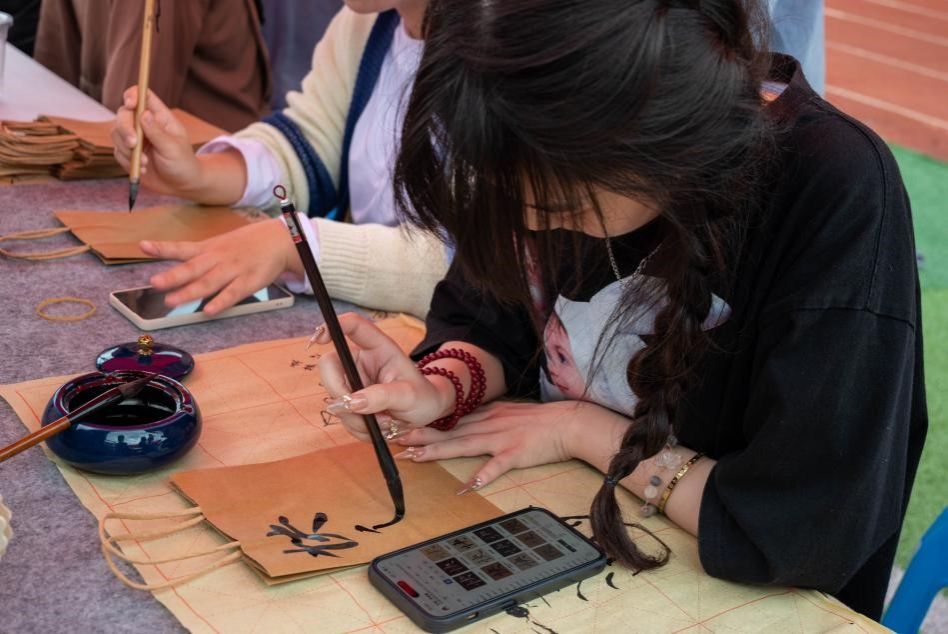 青花墨字书画社通过书法与绘画相结合,以歌词的韵律,用纸袋为承接,开展一系列独特新颖的书法展示与互动活动,消除传统书法的看法,以笔墨为媒,传递乐观向上,积极进取的心态和音乐之美。