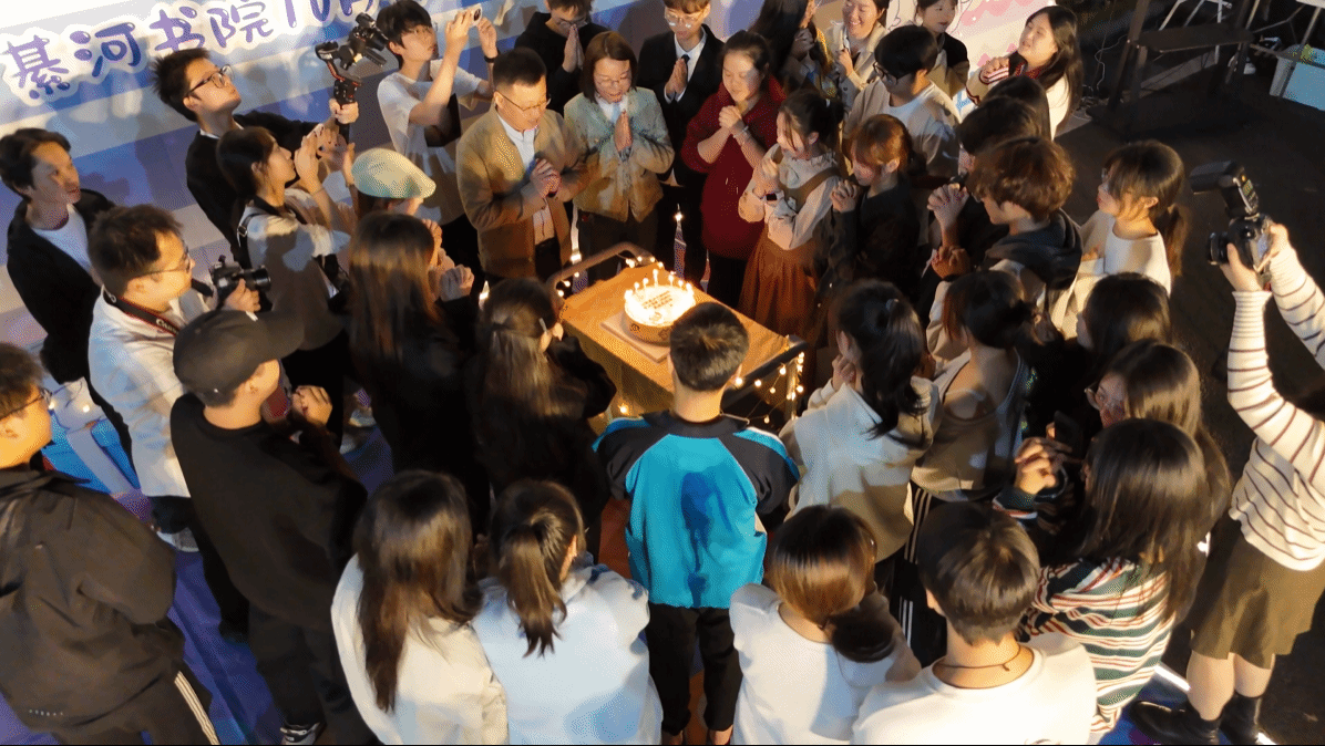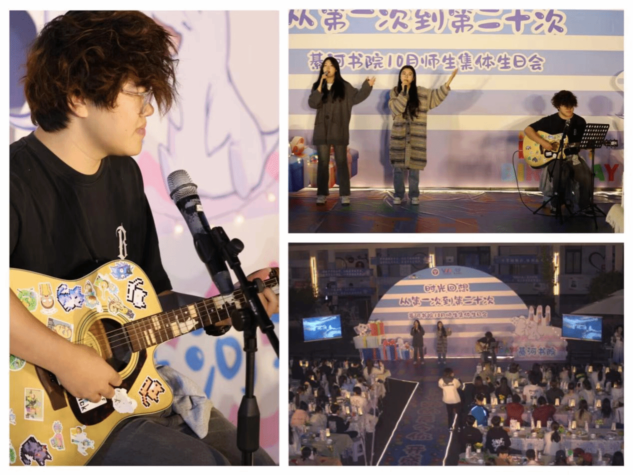 看着从第1次生日会到第20次生日会的回顾视频,感受着此刻亲朋好友送来的祝福,听着生日快乐歌,大家一同上台共同许下心愿,蜡烛点燃和熄灭的瞬间,一声“生日快乐”传递出最朴素的祝福。今天不仅是各位寿星的生日,亦是陪伴我们走过三载的綦河书院的生日,綦河书院自2021年10月24日以一场师生集体生日会的方式正式投入使用,今天刚好迈过三个年头,现场同学们也在此刻一同向綦河书院送上了最诚挚的祝福。这一刻不仅是对生日的庆祝,更是对未来美好生活的期许。