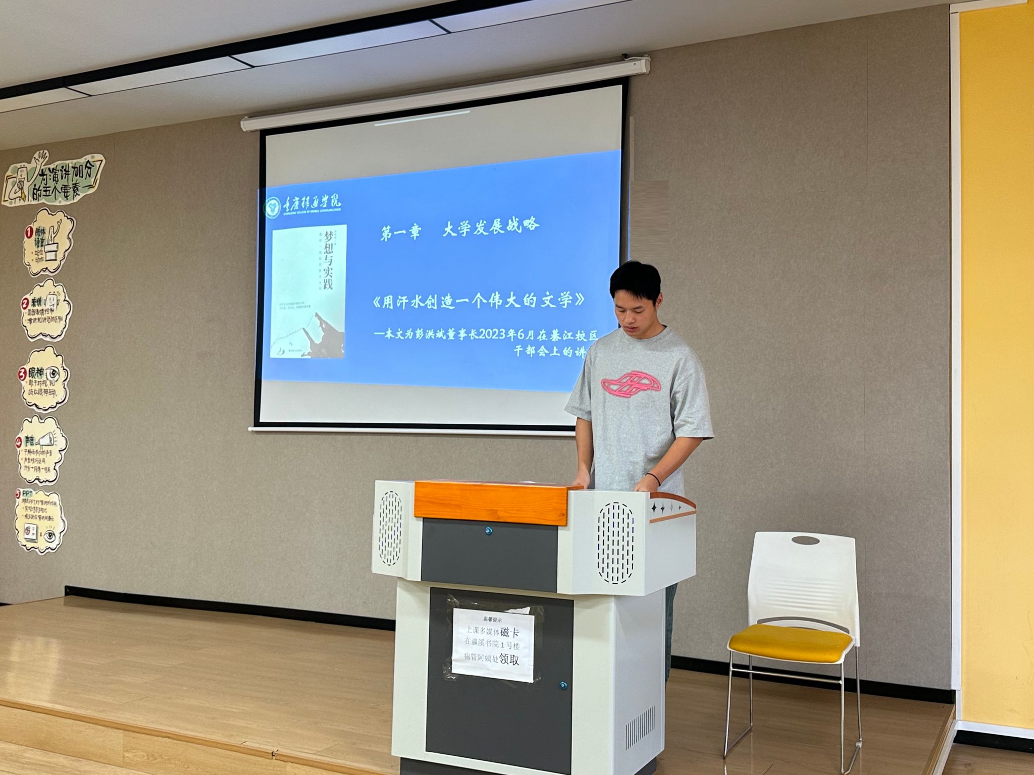 实训中心的陈正茂老师带领大家学习了董事长的《用汗水创造一个伟大的文学》,他分享到:彭董事长在綦江校区干部会上的讲话主要围绕艺术专业的发展、学校建设的艰辛历程、学费调整的必要性以及特色部门教学理念的创新等方面展开。他强调了艺术专业的重要性,分享了学校建设的感人故事,表达了对教师薪酬提升的关切,并鼓励特色部门在教学上进行创新,以培养学生的创造力和想象力。