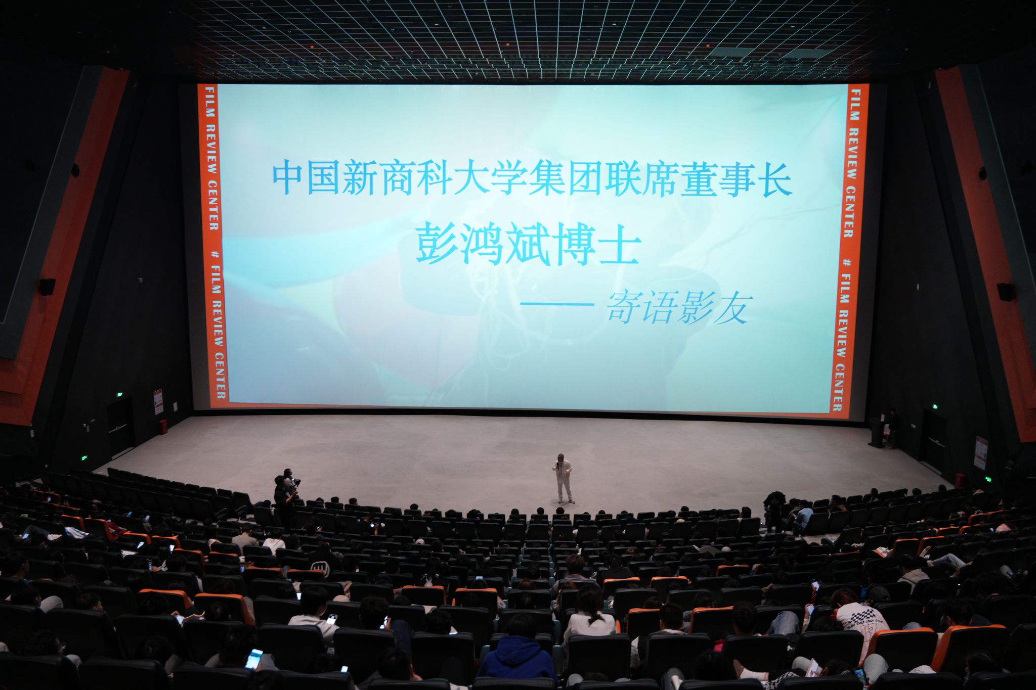 中国新商科大学集团联席董事长彭鸿斌博士对现场影友表达了他的期待与鼓励。谈到《红气球》这部电影,他认为每个人在生命中都有一个“红气球”,可以给我们安慰,让我们产生依恋。作为观众,观看电影是一件容易且幸福的事情,电影是一种社交和一种社会文化现象,能和别人产生共鸣。他表示,我们有中国最大的巨幕厅,有电影协会,我们三校四区的电影评论中心有60多位电影老师,有影响力覆盖全球的大学生影评大赛,基于电影本身而产生的一系列活动或平台,我们是全世界最完整、最大、最具体系的。他进一步指出,“(电影评论)这样的训练是一种科学的训练,是一种文艺的训练,是一种创意的训练,是一种思维的训练。”