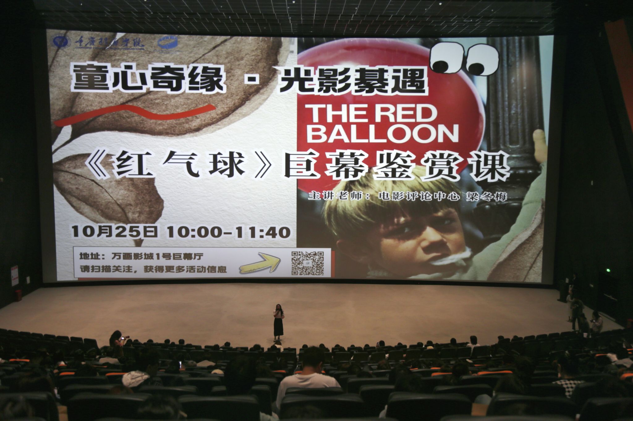 10月25日,电影评论中心、电影协会在万画影城巨幕厅开展了以“童心奇缘,光影綦遇”为主题的《红气球》巨幕电影鉴赏课。中国新商科大学集团领导、重庆移通学院校领导、綦江校区电影评论中心全体教师,以及近700位电影爱好者共同参与了此次活动。