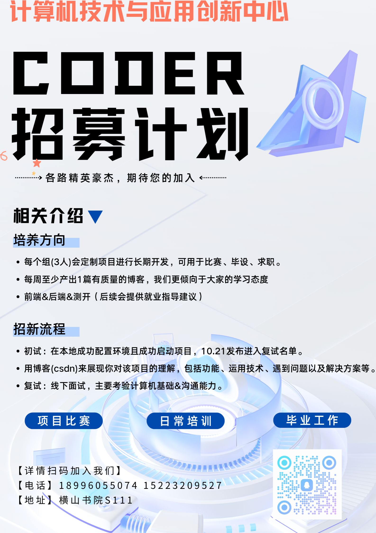 为深入践行学校“四位一体双院制+特色课程”的人才培养模式,计算机学院坚持以学生为中心,紧密围绕专业培养计划,致力于全面提升学生的创造力、想象力及领导力等综合素养。在此背景下,计算机学院计算机技术与应用创新中心(简称“创新中心”)联合横山书院于10月25日(本周五)圆满结束了第二届招新活动,本次招新旨在挖掘并培养更多具有创新精神和实战能力的计算机人才,进一步激发学生的潜能与活力。