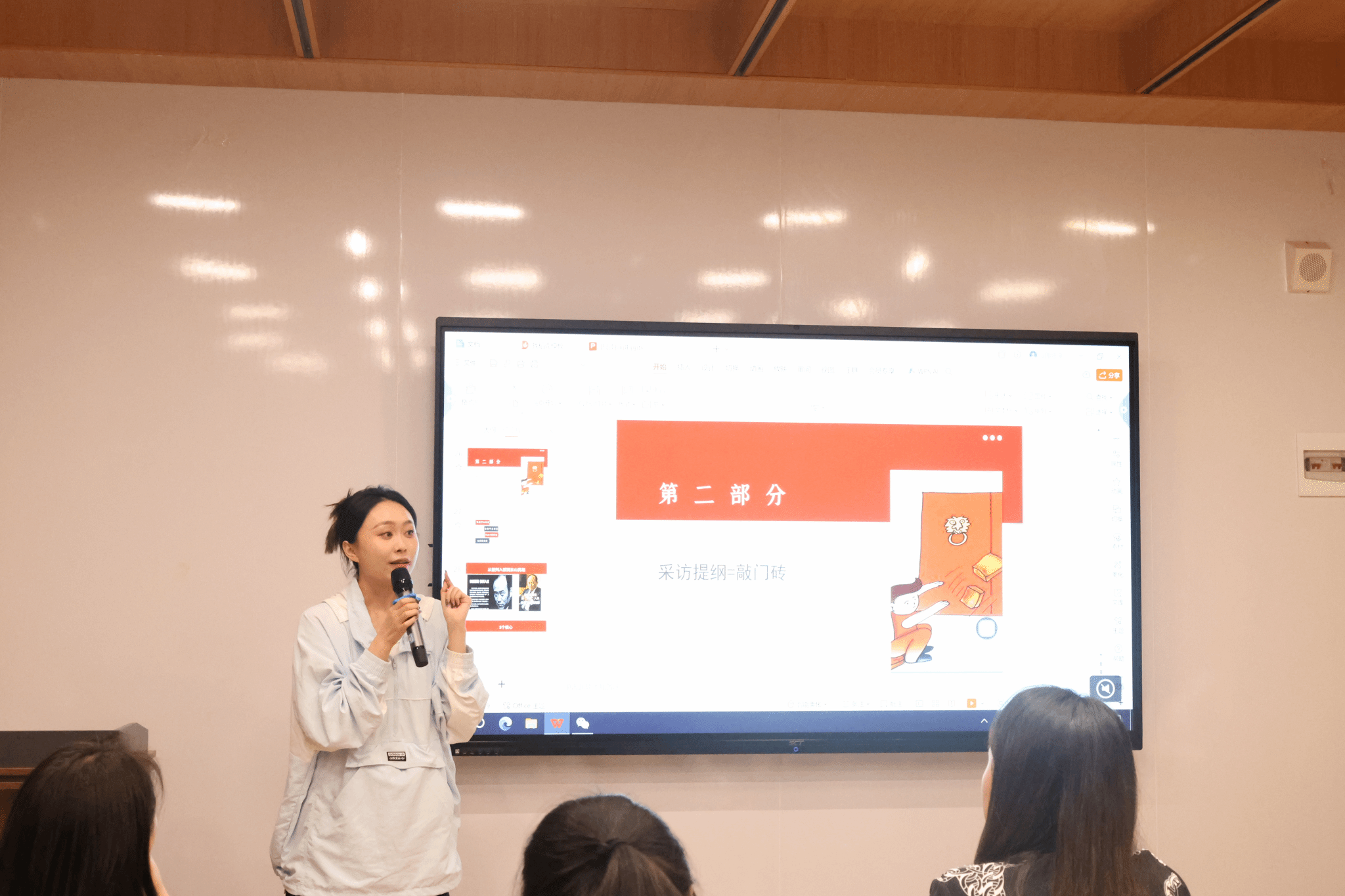 随后,新采学院校外媒体导师赵春雨老师就上周末外出采访中遇到的问题,对在座同学进行了讲解。她提到,在采访前,通常要拟定一个采访大纲,大纲需要有完整的逻辑线。很多同学在采访提问的时候逻辑不清晰,也就是在制作大纲的时候逻辑就没有理清。她希望,通过同学们能通过每次实践获得进步,逐渐成长为一名优秀的媒体人。