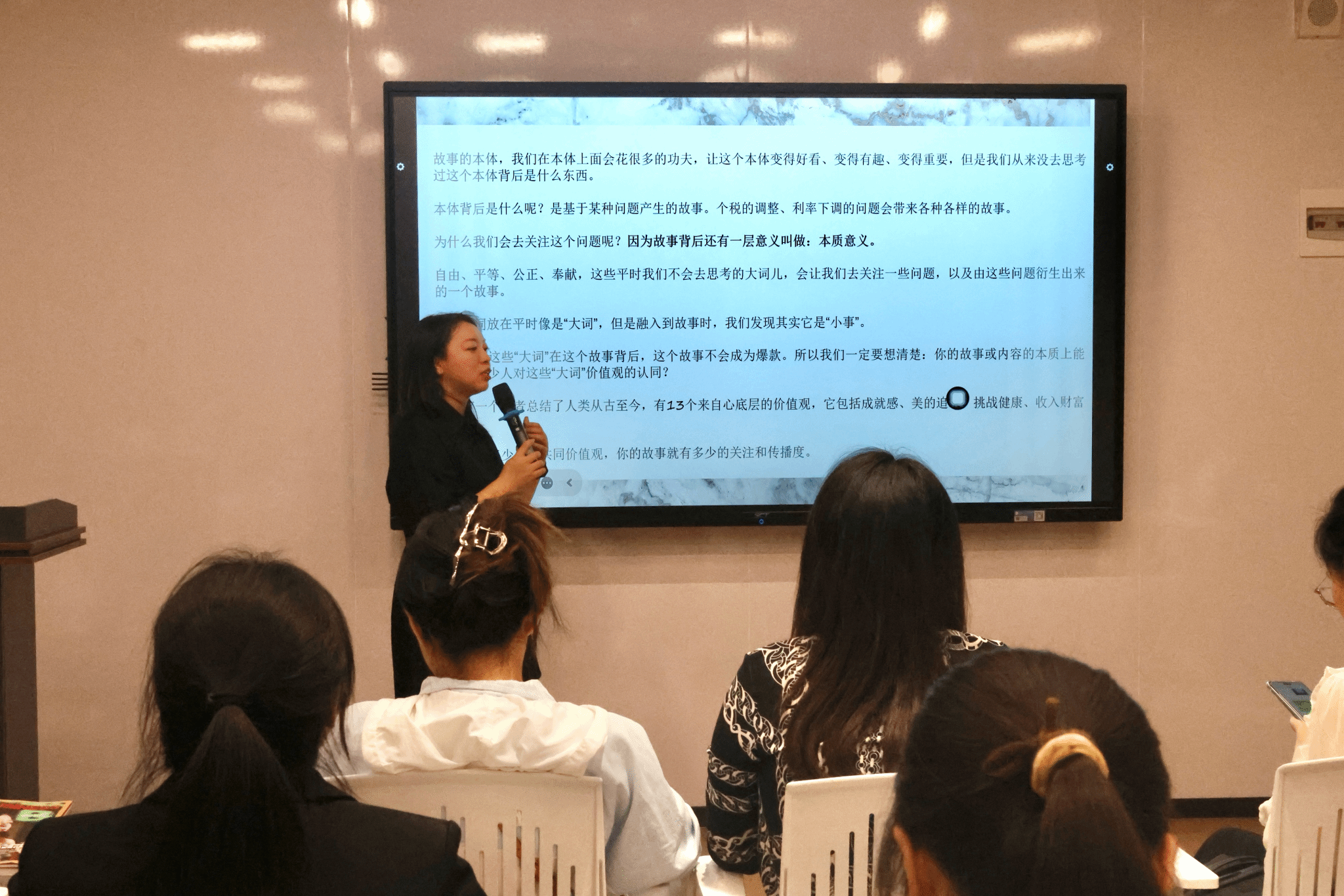 讲座初始,郝树静老师为在座同学介绍了朱作明老师,并引入正题——在当下的信息化时代,如何做一篇好的商业新闻。朱作明老师从有效传播到如何讲好故事,并用新流量时代的传播模型为我们具体分析了如何写好一篇新闻稿,以及引爆流量的密码。朱老师总结了好故事的三个层次:故事本体、背后问题、本质意义。其中,故事中的冲突很重要,能引起高潮,吸引更多流量。同时,也要从读者和用户的角度去思考问题,找出新的理解思路。好的故事离不开文学的积累,深层次的问题思考,同时也需要日常生活中对新闻的敏感捕捉。