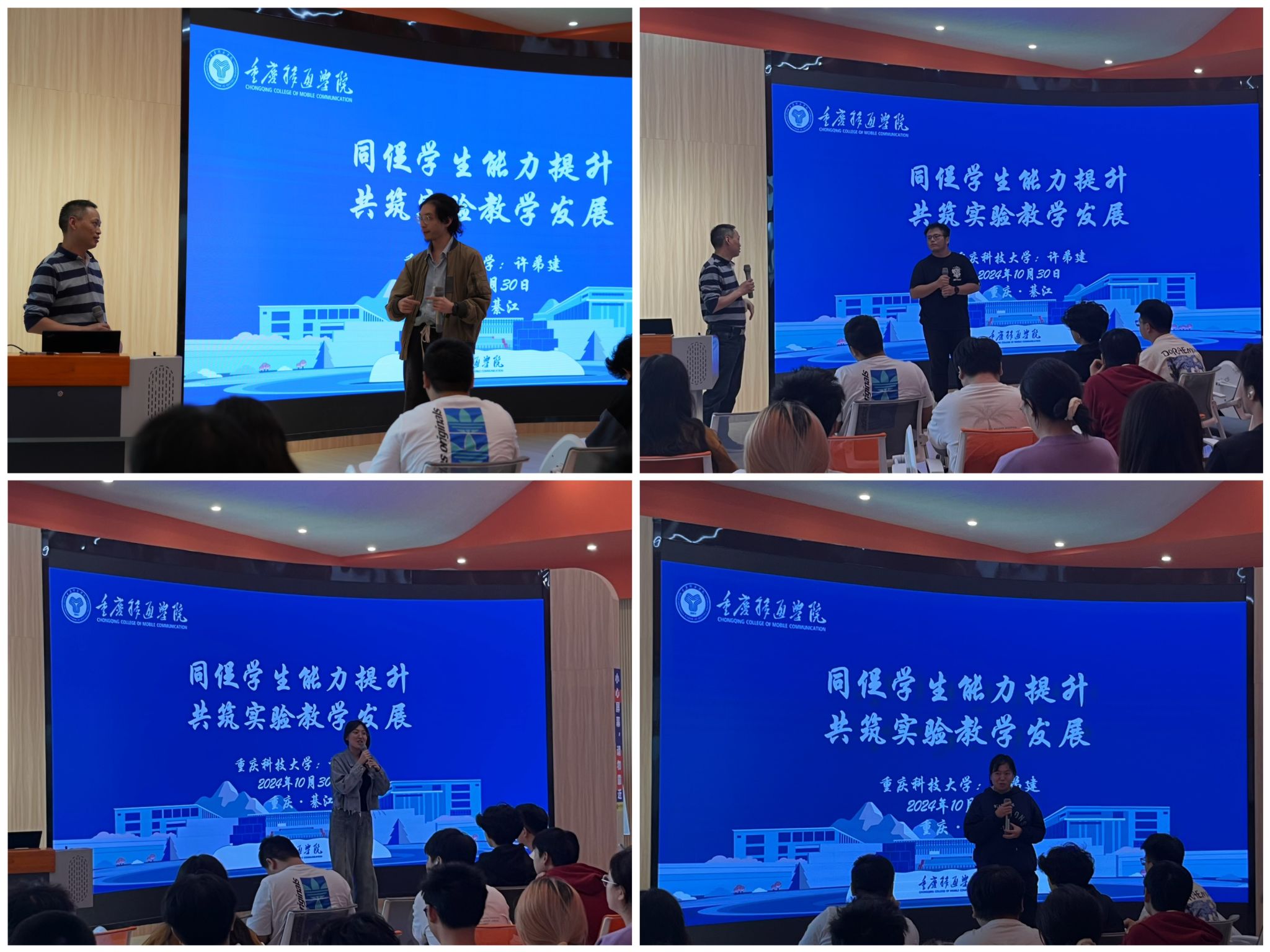 紧接着,在綦江校区实训中心郭爽主任的主持下,开展了“高校实验室建设与应用探索”专题讲座,许弟建副教授从群策群力搞策划、设备展览多参加、校际交流激灵感等理念中提炼出口袋实验室、虚拟实验室、可编程控制实验室、智能感知实验室建设思路,为我校实验室建设分享经验、提供灵感。