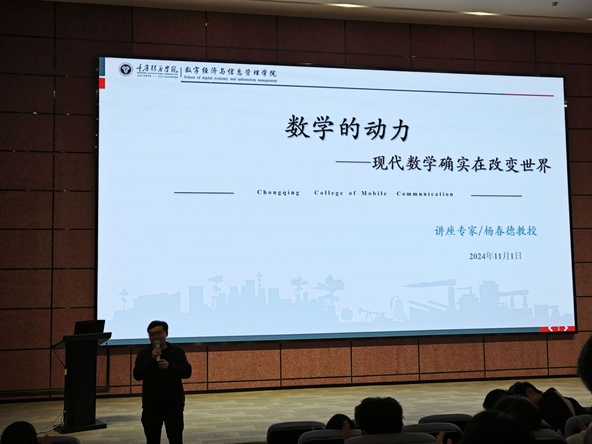 为提高学院学生对数学的认识和学习热情,2024年11月1日下午14:00,数字经济与信息管理学院、戏剧影视学院联合邀请数理教学部主任杨春德教授在贤者楼423为两个学院的师生带来了一场关于“现代数学确实在改变世界”的精彩讲座。此次讲座由数字经济与信息管理学院教学副院长王哲主持,两个学院教研室主任,专业建设负责人,核心课程负责人和学生代表参加。
