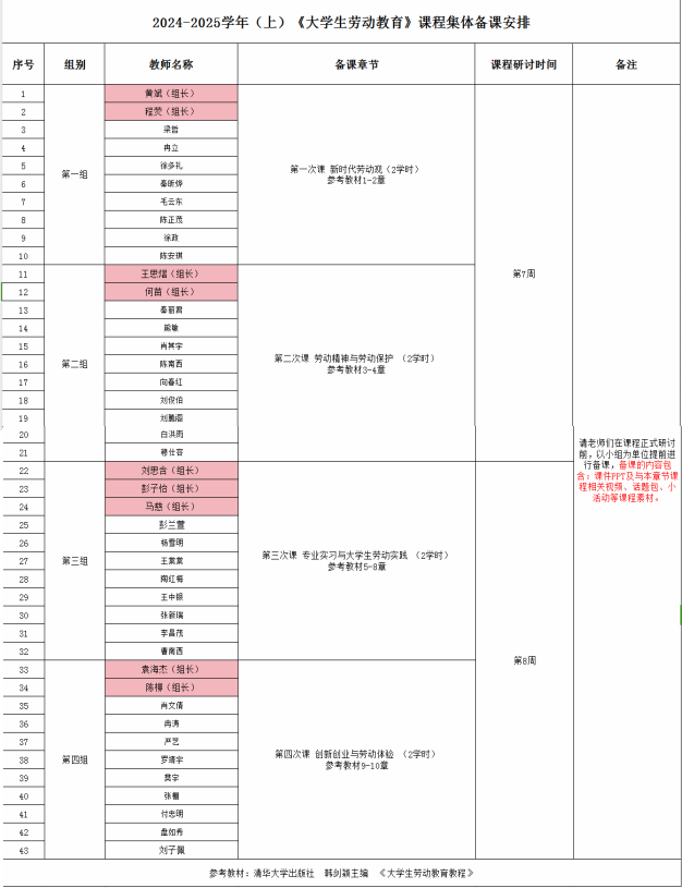 《劳动教育》课程的实施分为理论和实践两部分,理论课程一共8学时,本学期理论课程安排为第9-16周,覆盖2022级大三和2024级专升本的学生。课程研讨由前期任课老师分组集体备课和老师代表线下分享汇报两部分组成,全体任课老师分为四个小组,分别对应负责的课程章节开展集体备课,提高备课质量。