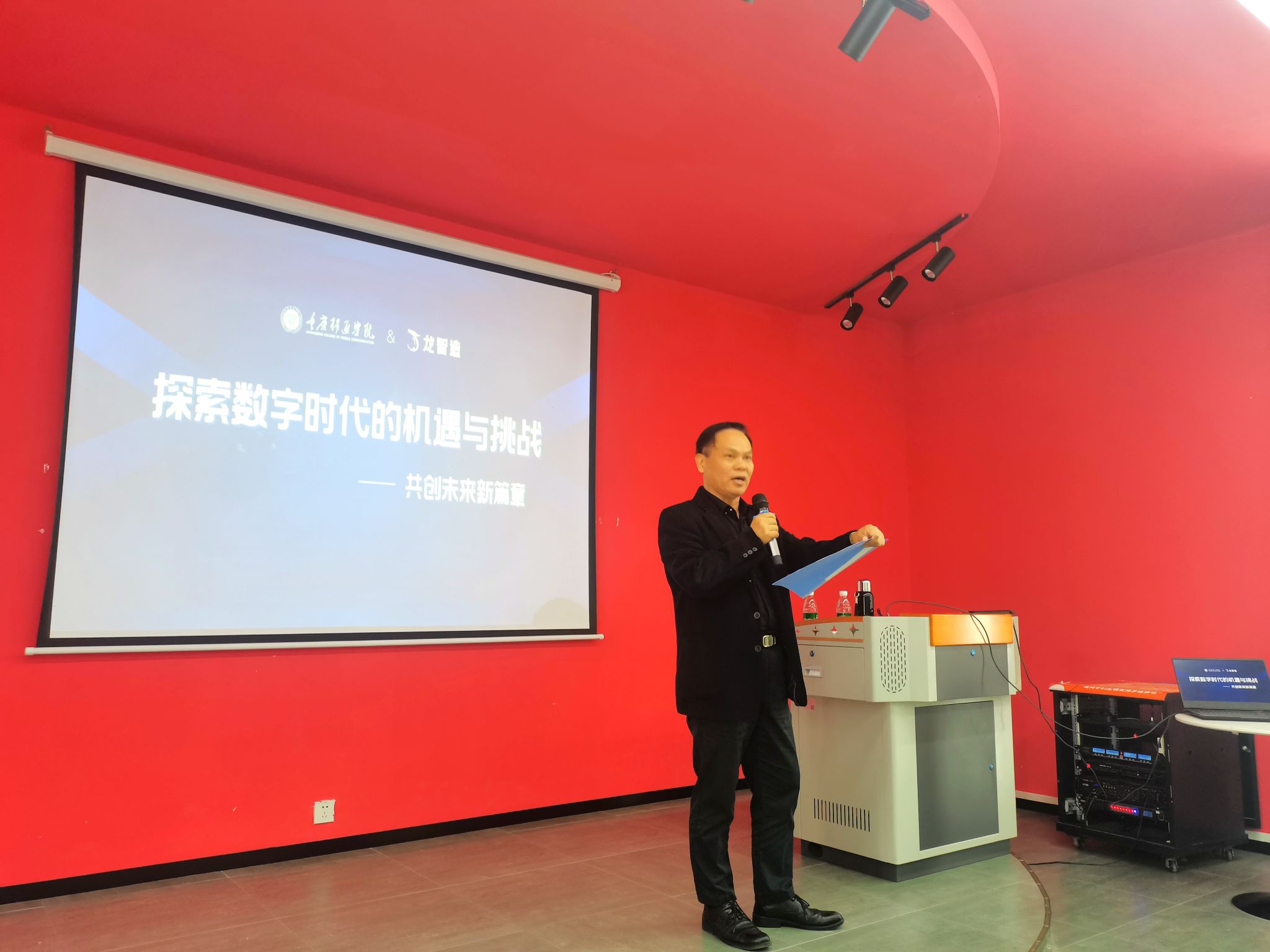 为深入探讨数字时代为计算机领域带来的机遇与挑战,激发新的思考,共同探索未来的无限可能。2024年11月5日下午计算机学院特别邀请重庆龙智造互联网科技有限公司的董事长胡守荣举办了一场主题为《探索数字时代的机遇与挑战》的专题讲座,本次讲座由计算机学院林泽金副院长主持。