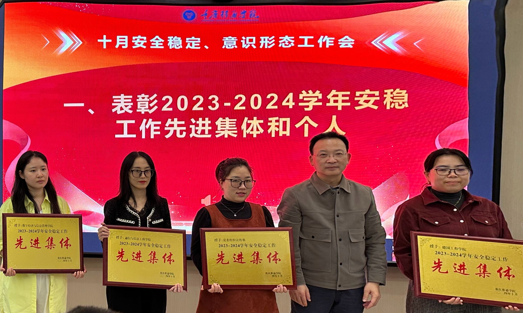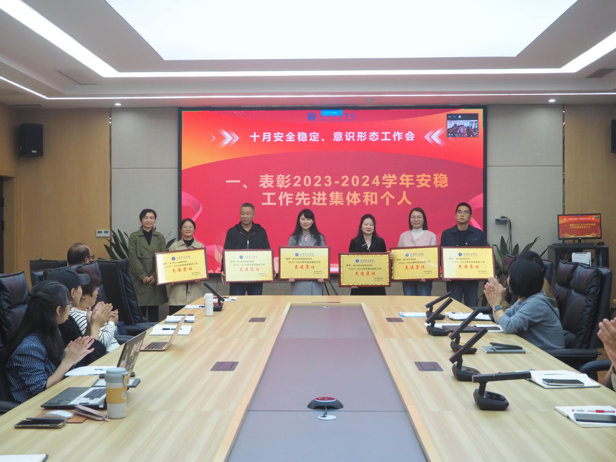 11月4日下午,学校月度安稳工作会议暨2023-2024学年安稳工作先进表彰大会顺利召开。会议对10月安全稳定、意识形态工作进行总结,对11月安全稳定、意识形态工作进行部署,并对12个先进集体、32名先进个人进行表彰。校党委书记何先刚、校长吕翊、在家校领导、各职能部门负责人、二级学院负责人及学工系统负责人、安稳办全体成员参加会议。