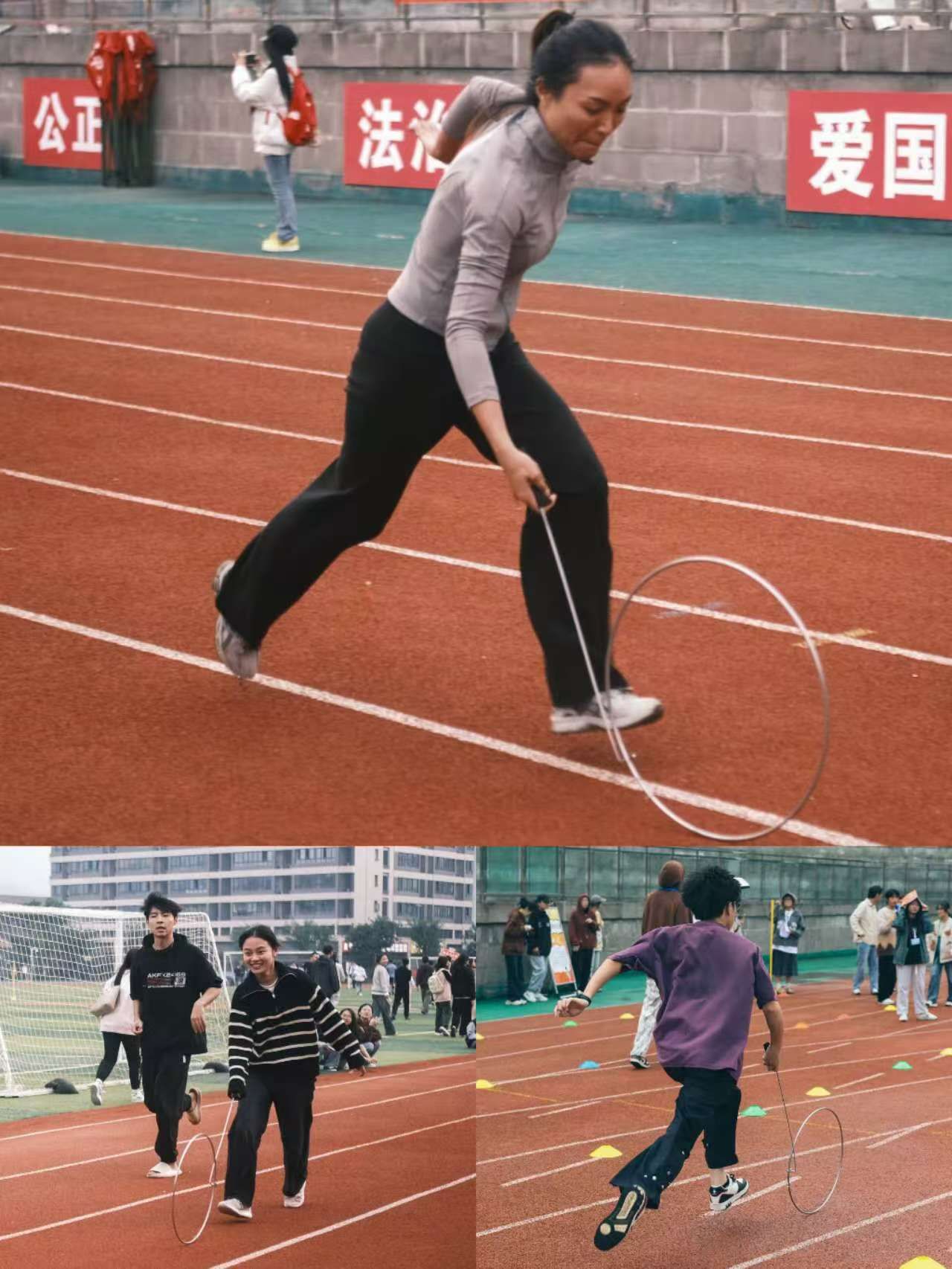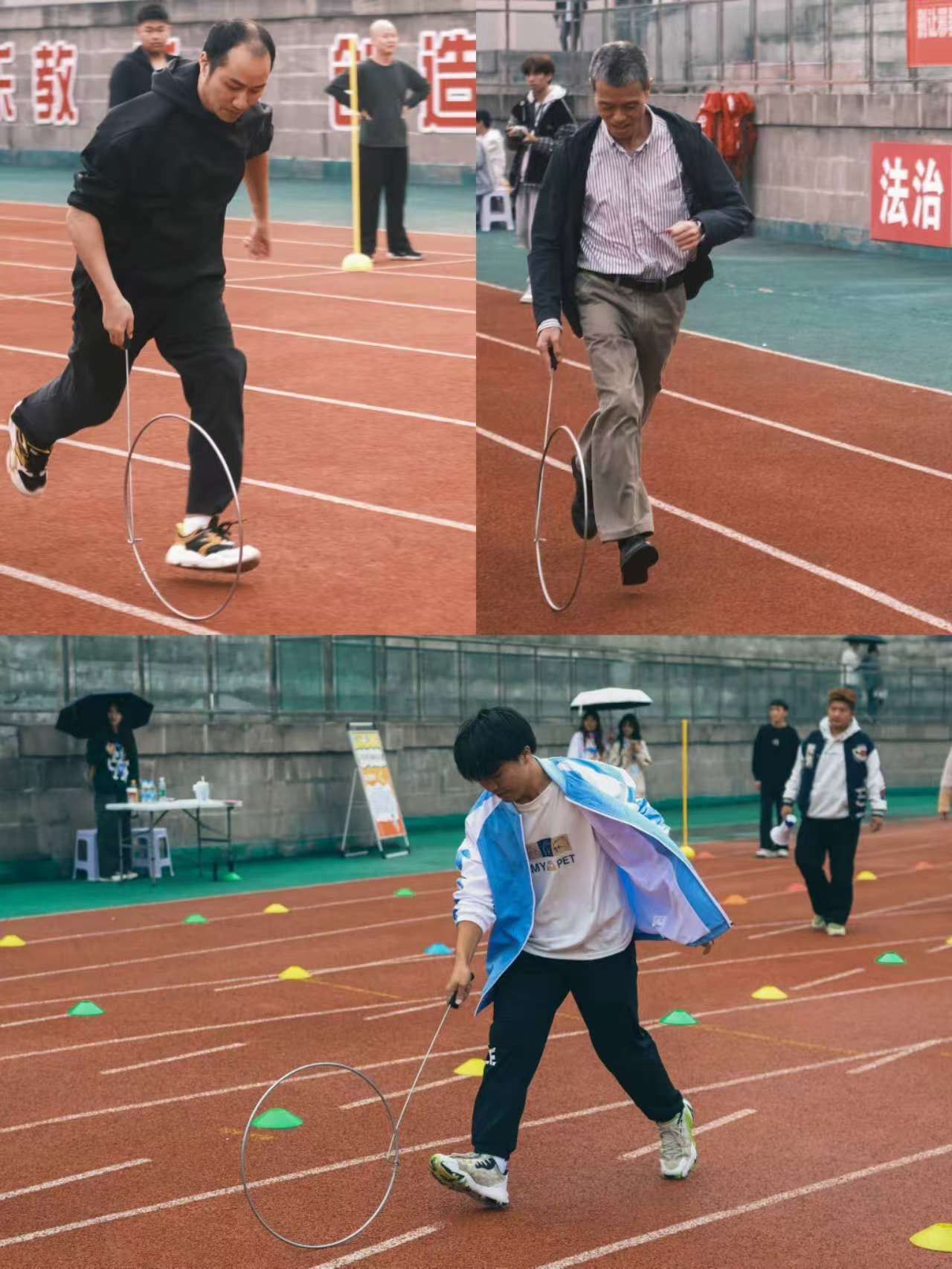 赛场上,一个个铁环仿佛变成了燃烧着火焰的“风火轮”。选手们手持铁钩,推动着铁环飞速前进。他们眼神专注,步伐矫健,努力控制着铁环的方向和速度。铁环滚动的声音如同激昂的战鼓,激励着每一位选手奋勇向前。老师和学生们在比赛中尽情释放着自己的活力与激情。有的选手技术娴熟,铁环在他们的操控下如臂使指,一路疾驰;有的选手虽然略显生疏,但依然坚持不懈,努力追赶。比赛过程紧张刺激,观众们的加油声、欢呼声此起彼伏,整个赛场沉浸在一片热烈的氛围之中。