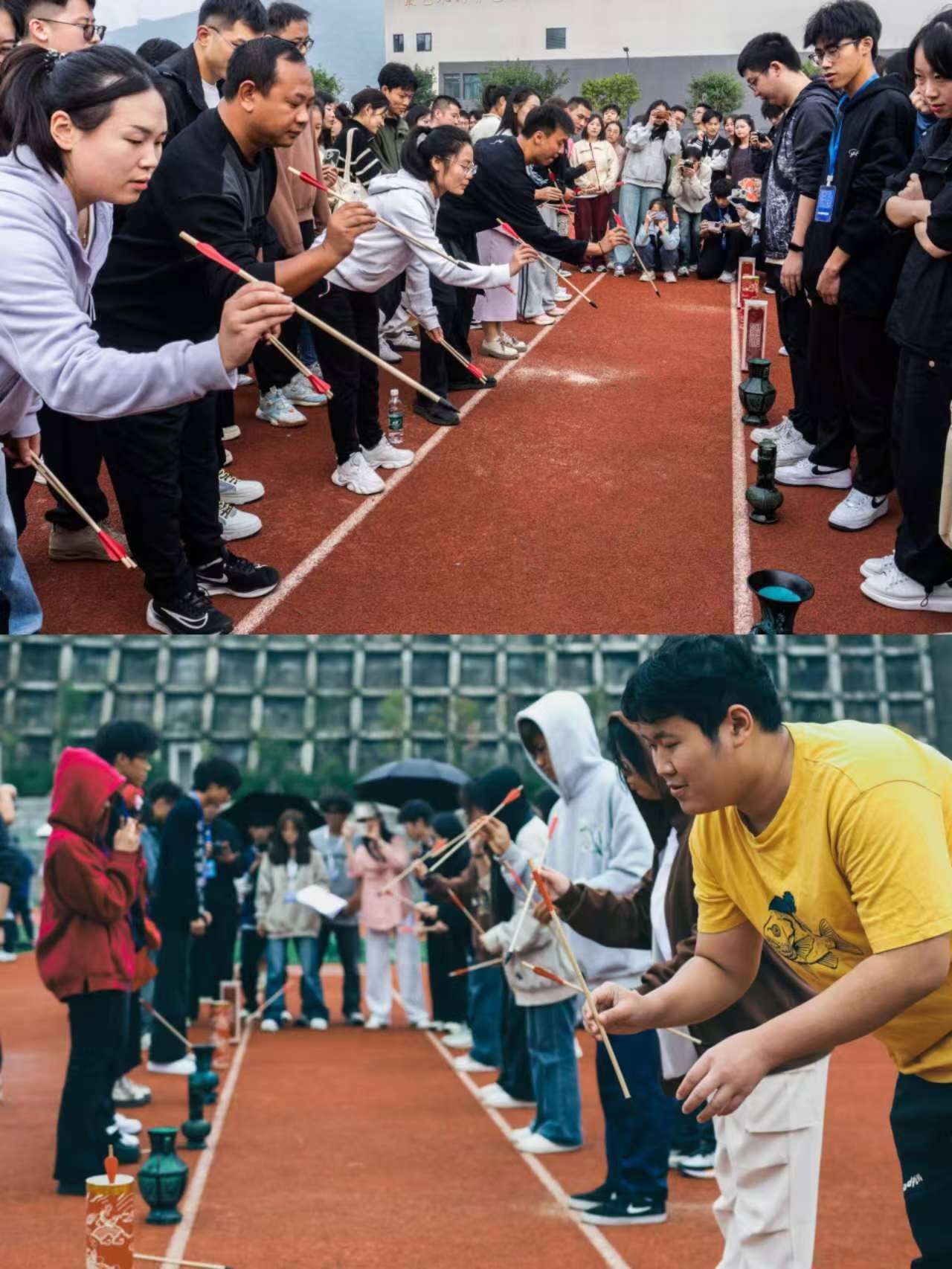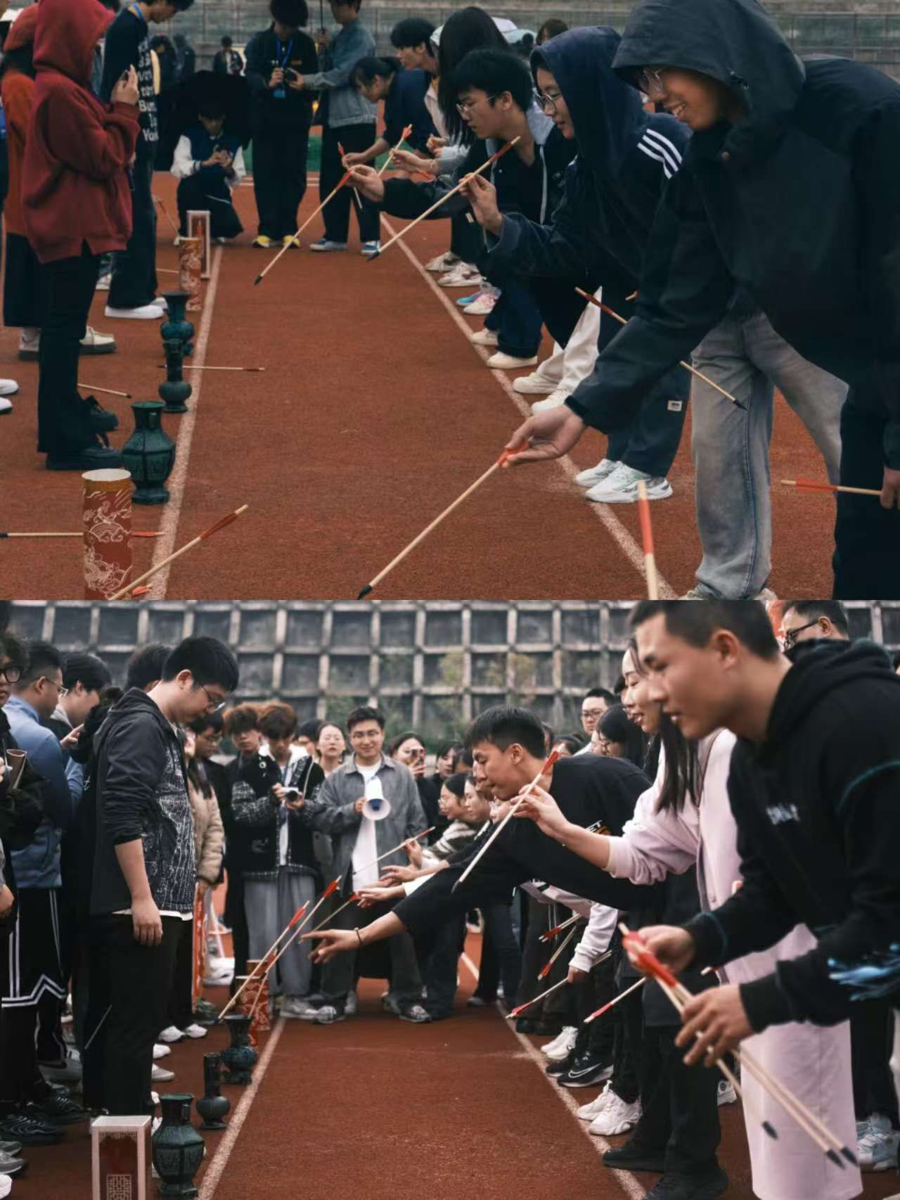 投壶现场,气氛热烈而紧张。参与者们个个全神贯注,目光紧紧锁定壶口,手中的箭矢稳稳拿住,瞄准目标后轻轻投出。每一支箭矢的飞出,都伴随着众人的期待,或欢呼雀跃,或遗憾叹息。老师和学生们在投壶过程中,不仅展现了出色的专注力和技巧,更流露出对传统文化的热爱与尊重。