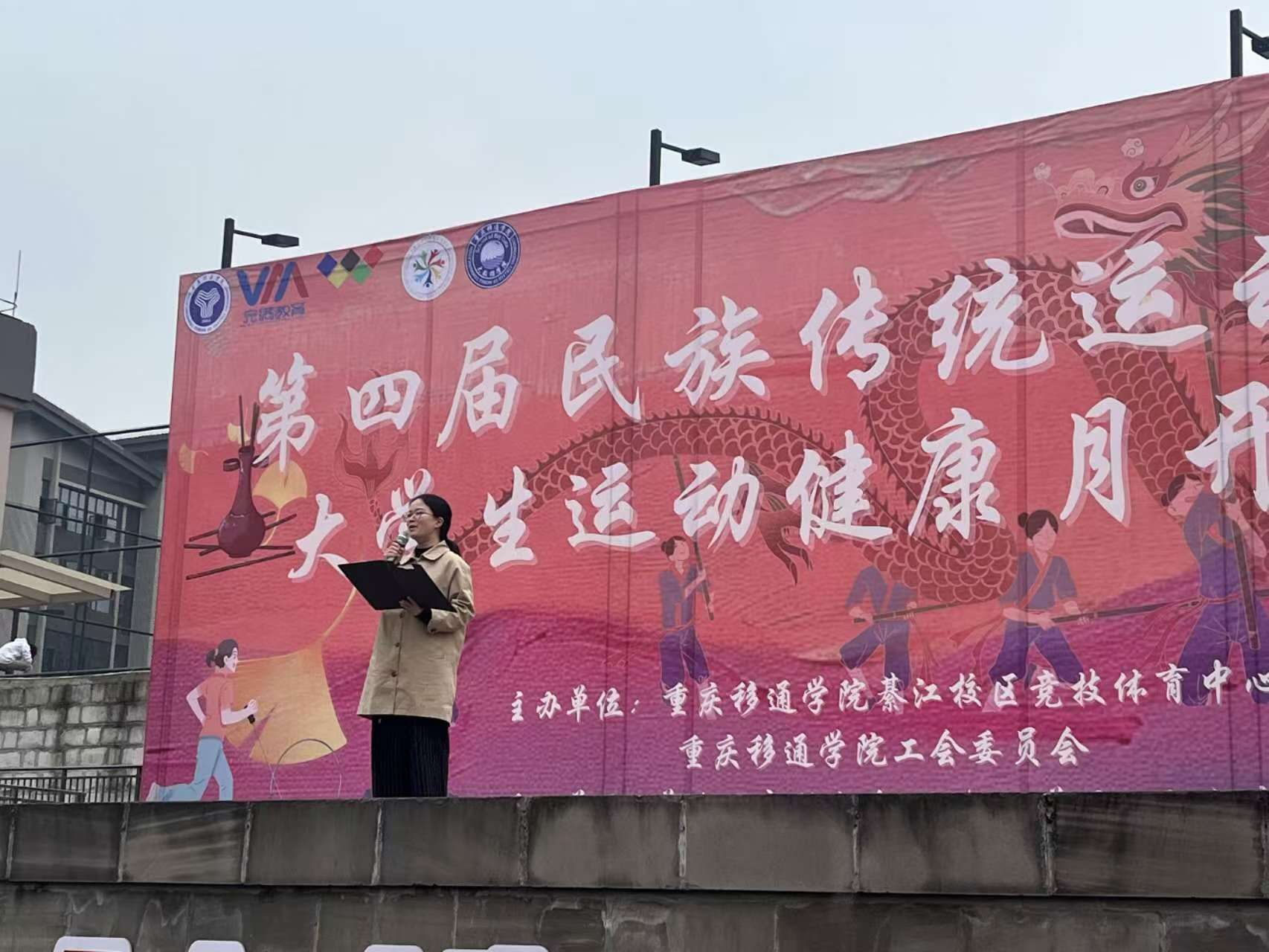 “第四届民族传统运动会暨大学生运动健康月开幕式”于15:00在运动场上开幕。大数据学院副院长阙小梅老师在开幕式上致辞,表示民族传统体育是中华文化的瑰宝,它承载着中华民族的历史记忆和文化基因。 弘扬民族传统体育,对于推动全民健身、促进健康中国建设具有重要意义,并且要继续加强民族传统运动的挖掘、保护和传承工作。