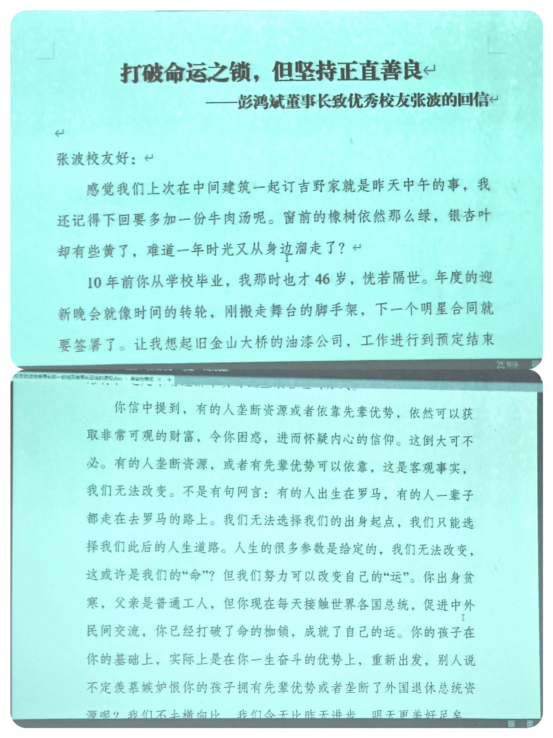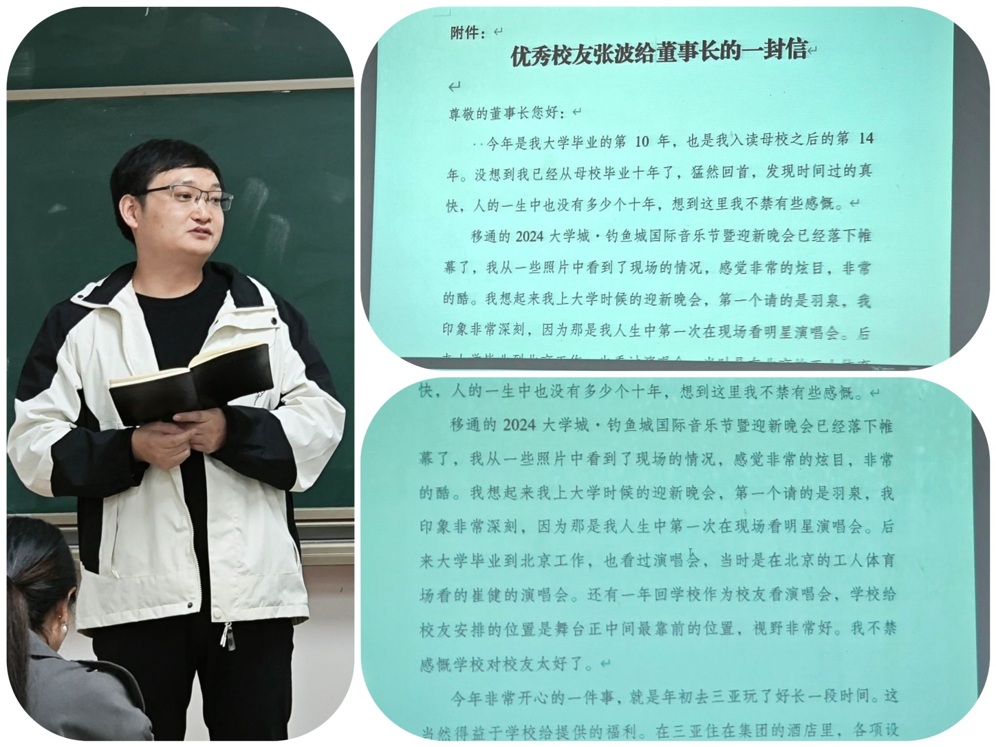 王副院长首先介绍了优秀校友张波,作为从母校走出并在各自领域取得卓越成就的代表,在信中校友满含深情地回顾了在校期间的点滴,感恩母校的培养以及董事长领导下的校园文化对其成长的深刻影响。信里不仅分享了自己在事业发展中的经验和感悟,更表达对母校的眷恋和对董事长领导理念的尊重。