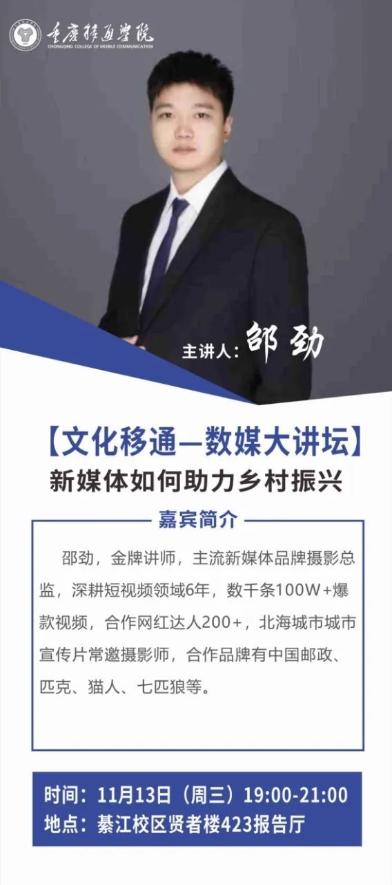 2024年11月13日19:00,重庆移通学院数字媒体产业学院邀请到金牌讲师邵劲做客数媒大讲坛,带来主题为《新媒体如何助力乡村振兴》讲座。邵劲老师以渊博的知识和深刻的见解,勾勒出乡村发展的璀璨蓝图。