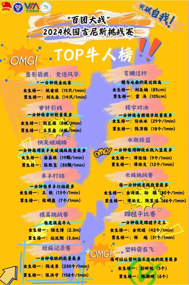 在这个充满无限可能的校园里,每一次挑战都是一次成长的契机,每一次突破都是对自我的重新定义。携手并进,向着更高的目标进发,让青春在挑战中绽放,让梦想在奋斗中飞翔!“TOP牛人榜”,明年等你揭榜!