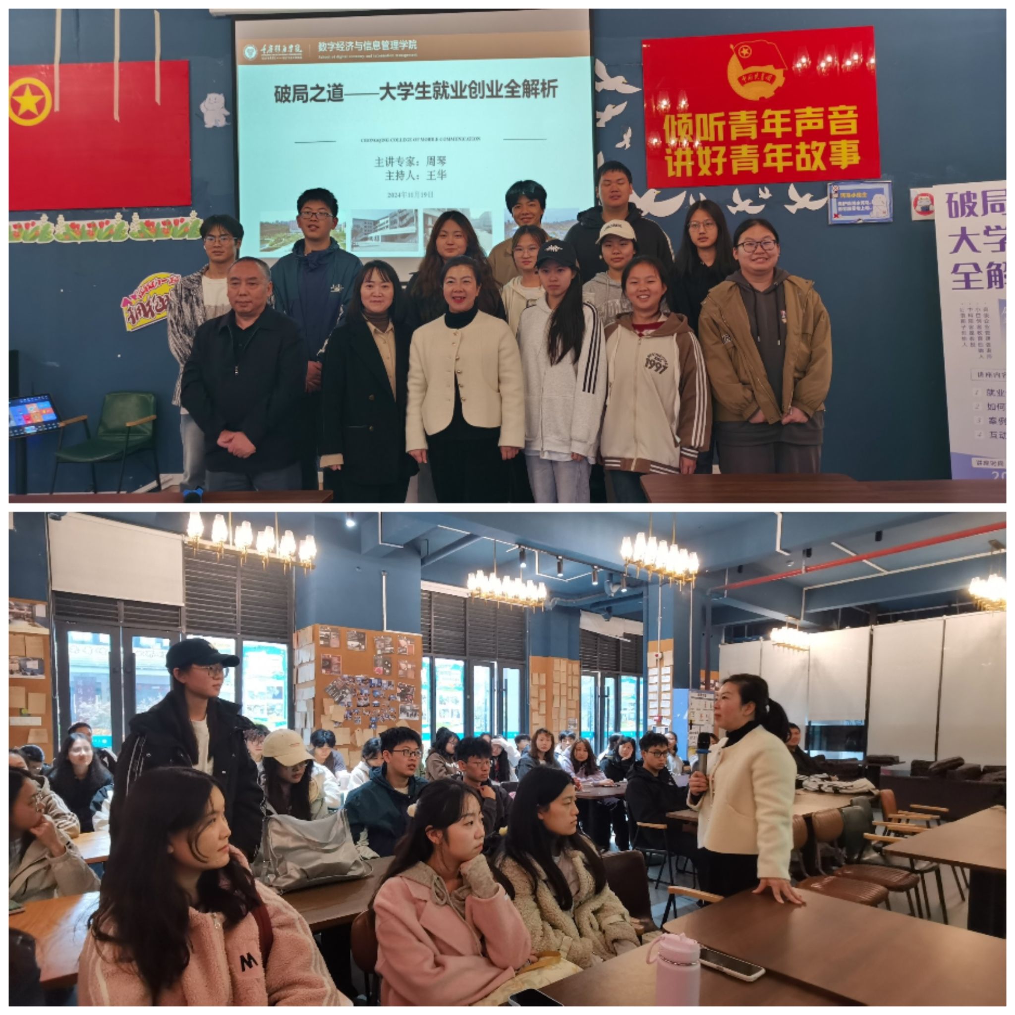 为了让学院师生了解最新的大学生就业创业形势,拓宽就业视野,数字经济与信息管理学院于11月20日14:00在綦河书院东篱・故事茶馆举办了“数智汇”34期—“破局之道:大学生就业创业全解析”的企业专家讲座活动。此次活动邀请了“后浪圈子就业创业辅导”创始人、成都小白创客教育咨询有限公司总经理、中国管理科学研究院商学院客座教授周琴老师,由工程管理教研室王华老师主持,工程管理专业部分师生参加。