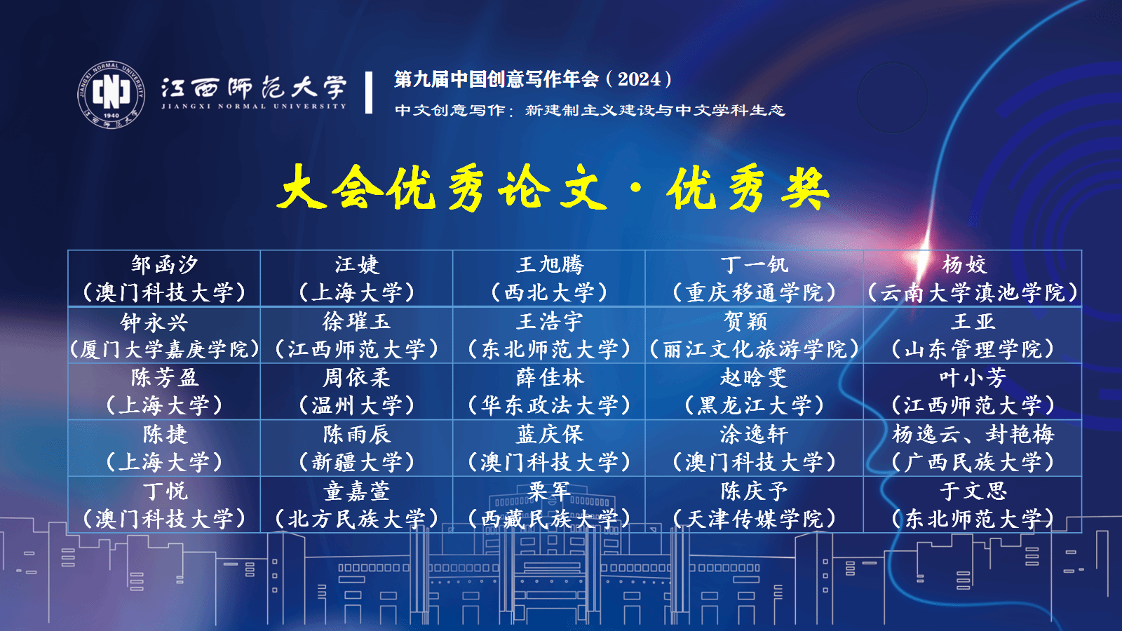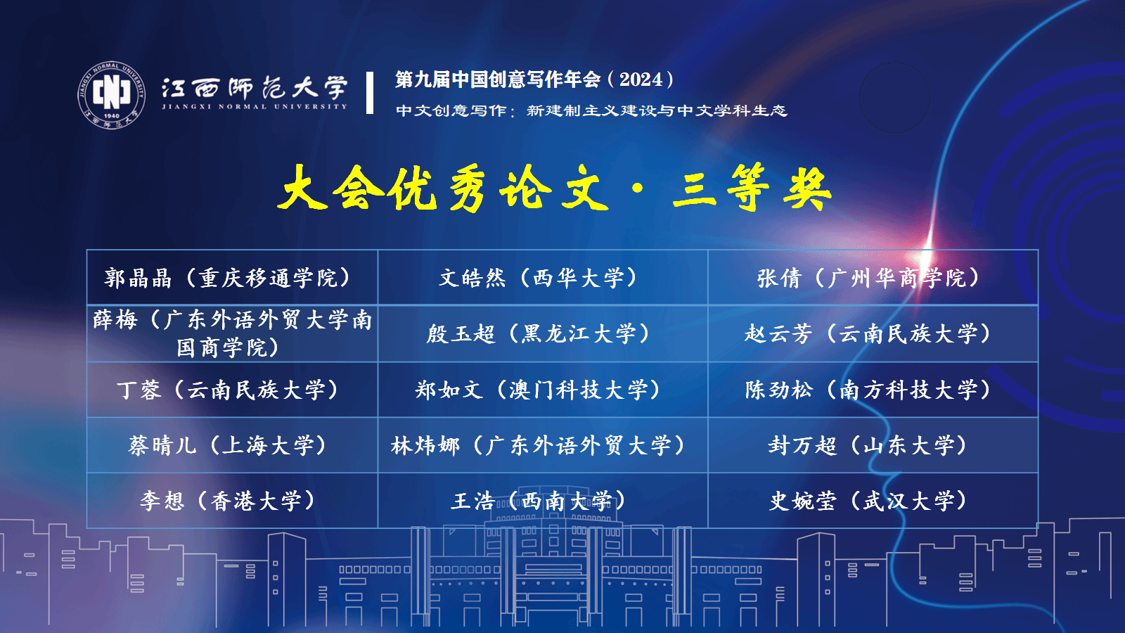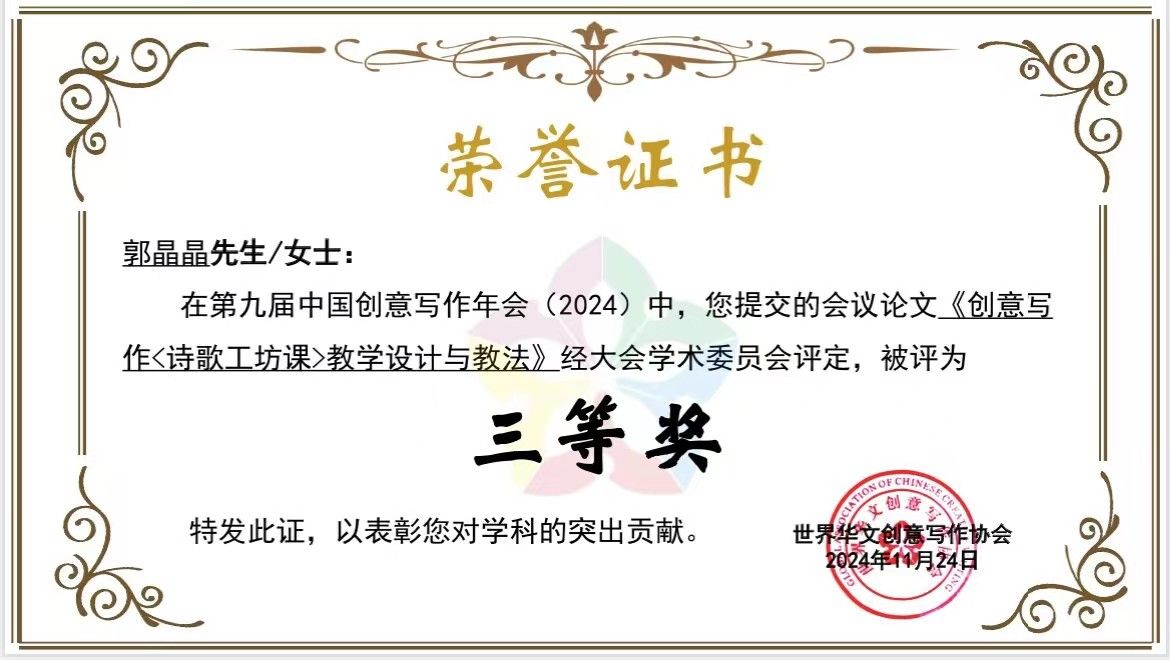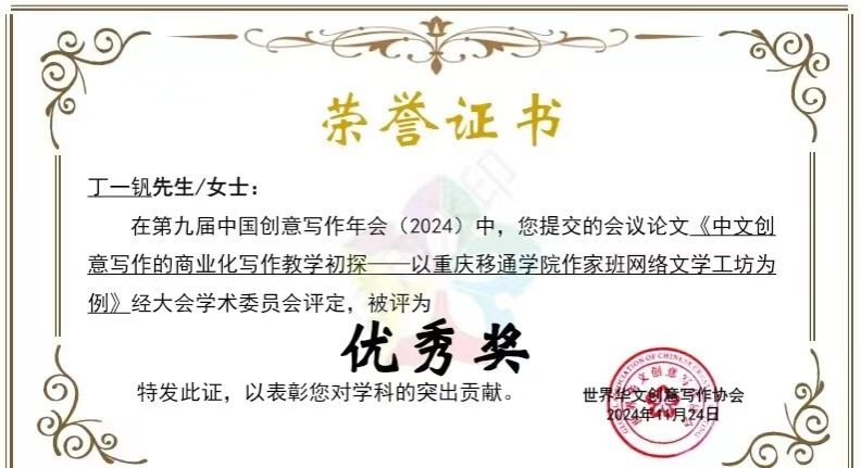 2024年11月22日至24日,第九届中国创意写作年会在江西南昌召开。为展示教育教学成果与加强创意写作学科建设,重庆移通学院创意写作学院派出教师代表团队前往江西南昌参加本次会议,并就创意写作教学实践等议题作出发言。綦江校区苏瓷瓷副院长与丁一钒老师提交的论文分别荣获第九届中国创意写作年会三等奖与优秀奖。