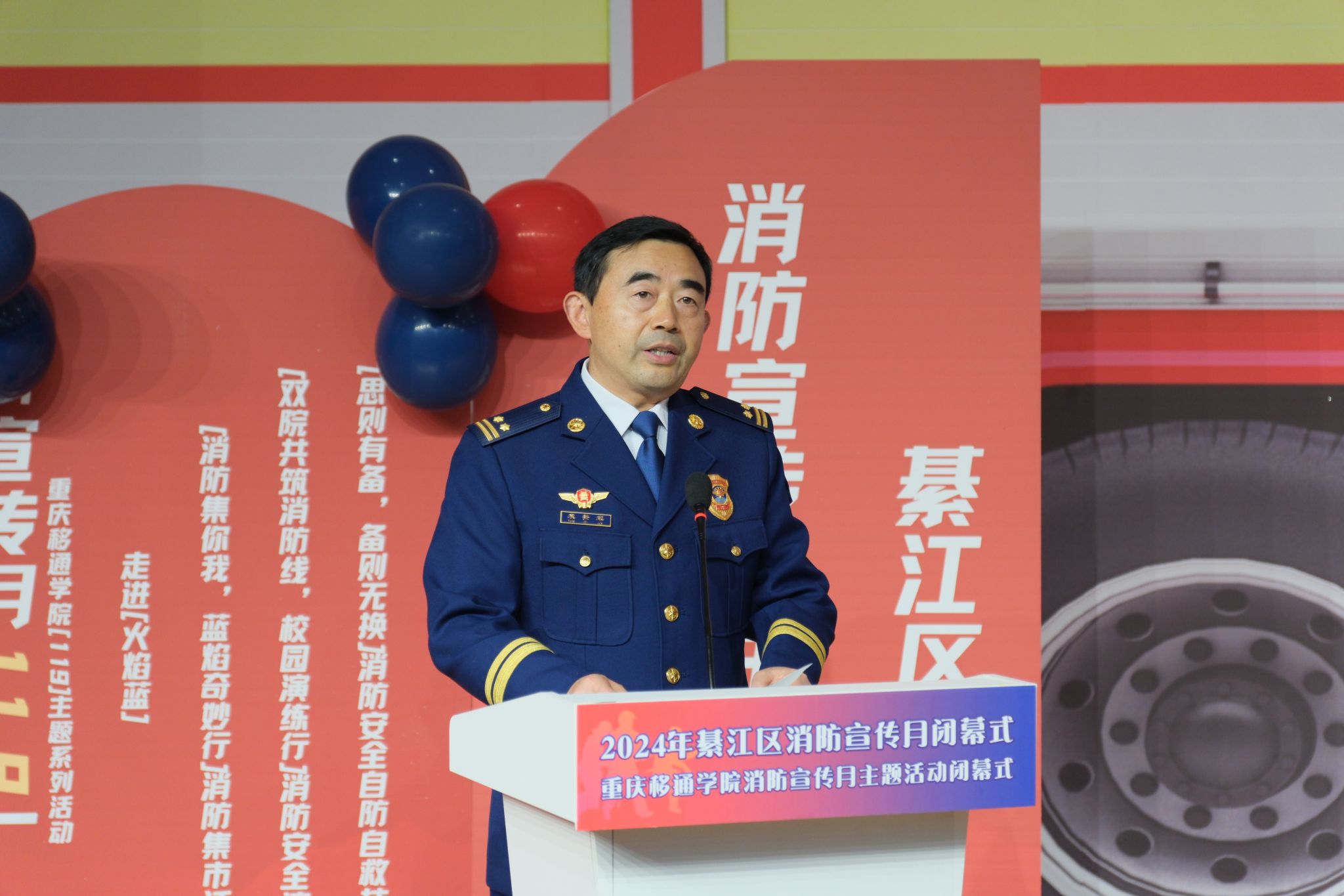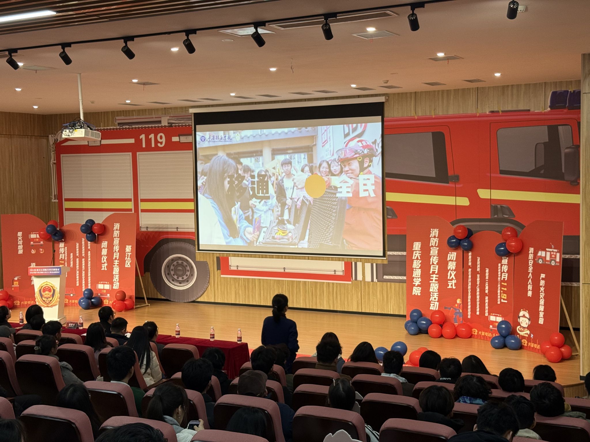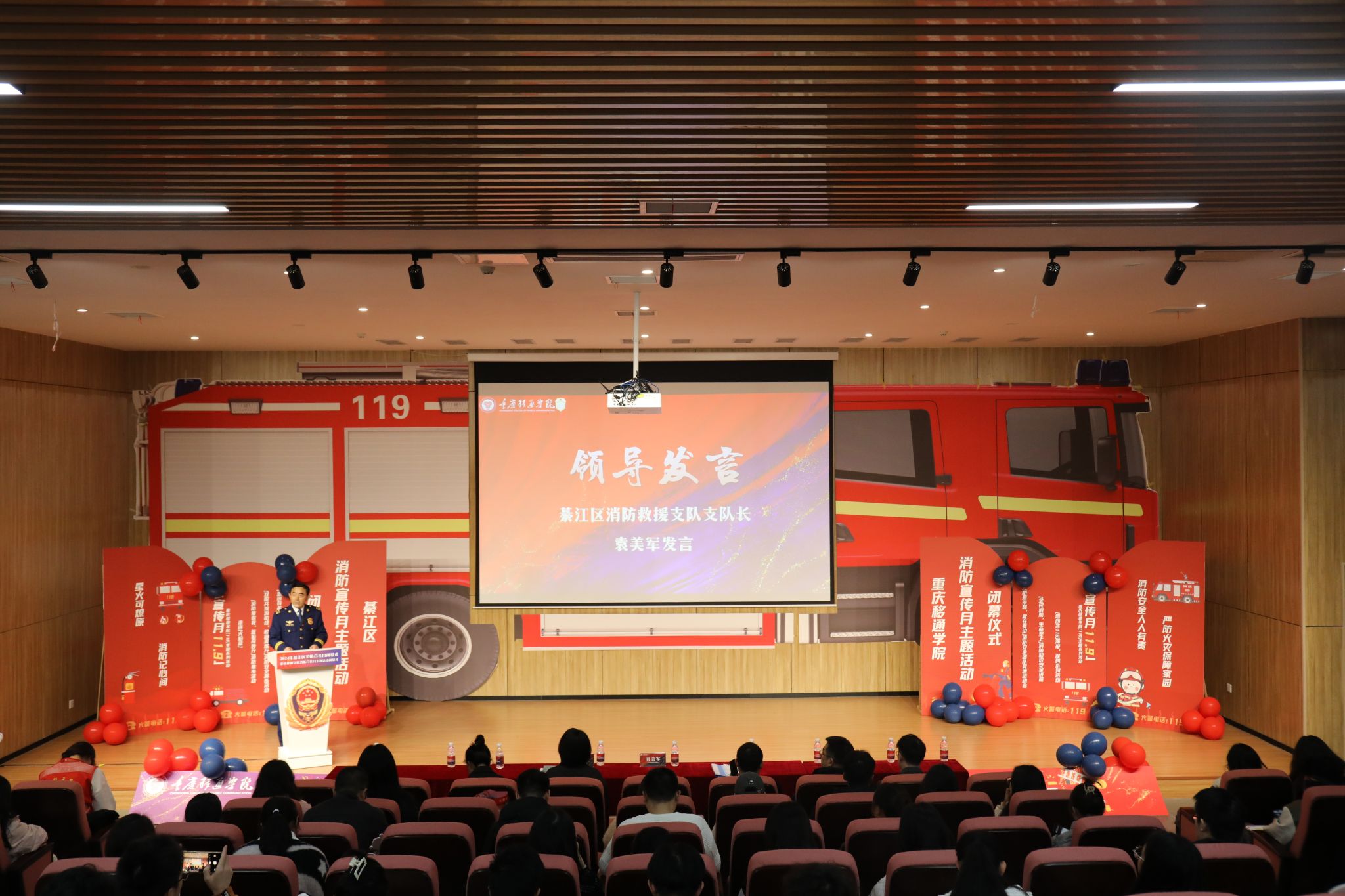 綦江区消防救援支队支队长袁美军、重庆移通学院校长助理谢银平,活动承办部门负责人、各学院学生工作负责人,校区安稳办成员单位代表参加了仪式。通过仪式回顾了整月活动内容、梳理了宣传教育成果、巩固了消防知识技能、提升了校园消防安全水平,营造了浓郁的安全学习氛围。