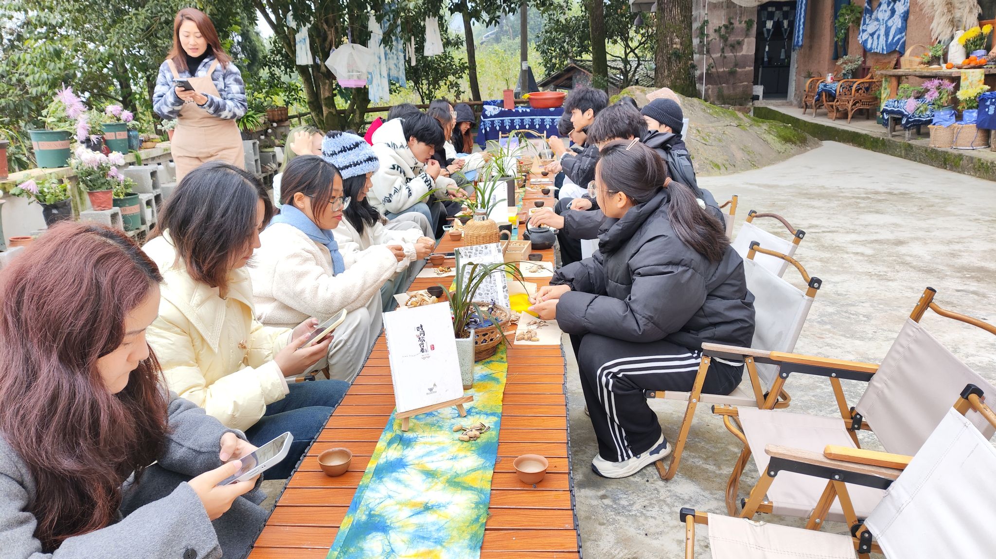一踏入红岩村东坡树下的小屋,满树柑橘的清香与古老小院的宁静气息便扑面而来。院内,各式扎染作品陈列其中,各色植物繁茂生长,充满了自然的生机。在这样的环境里,师生们开始了与红岩村的一次文化交流之旅。