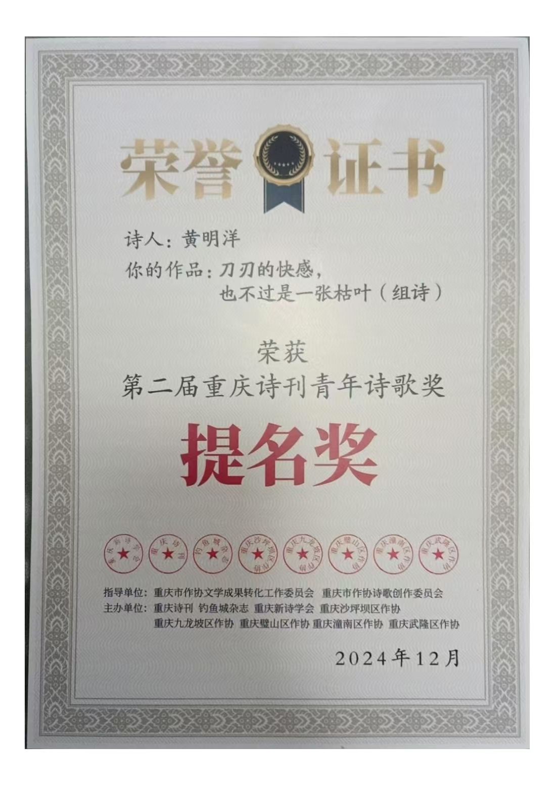 2024年12月6日,第二届《重庆诗刊》青年诗歌奖颁奖典礼在重庆市威灵顿酒店盛大举行。本次典礼吸引了诗人、文化界人士及众多文学爱好者的参与,现场气氛庄重而热烈。重庆市作家协会主席张者,《红岩》杂志常务副主编欧阳斌,重庆新诗学会会长胡万俊,重庆电力作家协会主席李炼以及著名诗人刘清泉、吴向阳、姚彬、大窗、陈广庆等文化界知名人士出席了此次盛会。重庆移通学院綦江校区创意写作学院青年教师黄明洋获得提名奖。