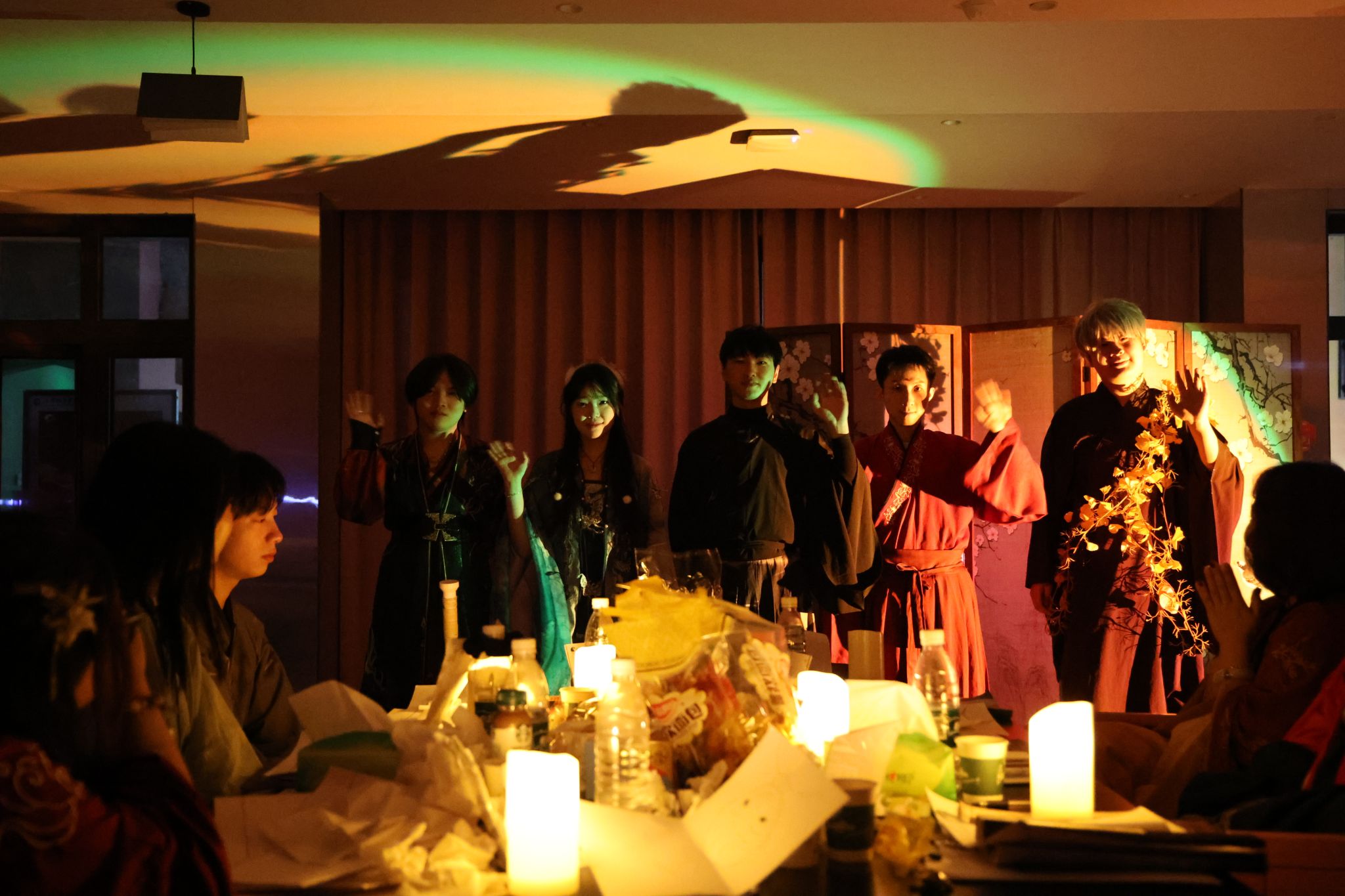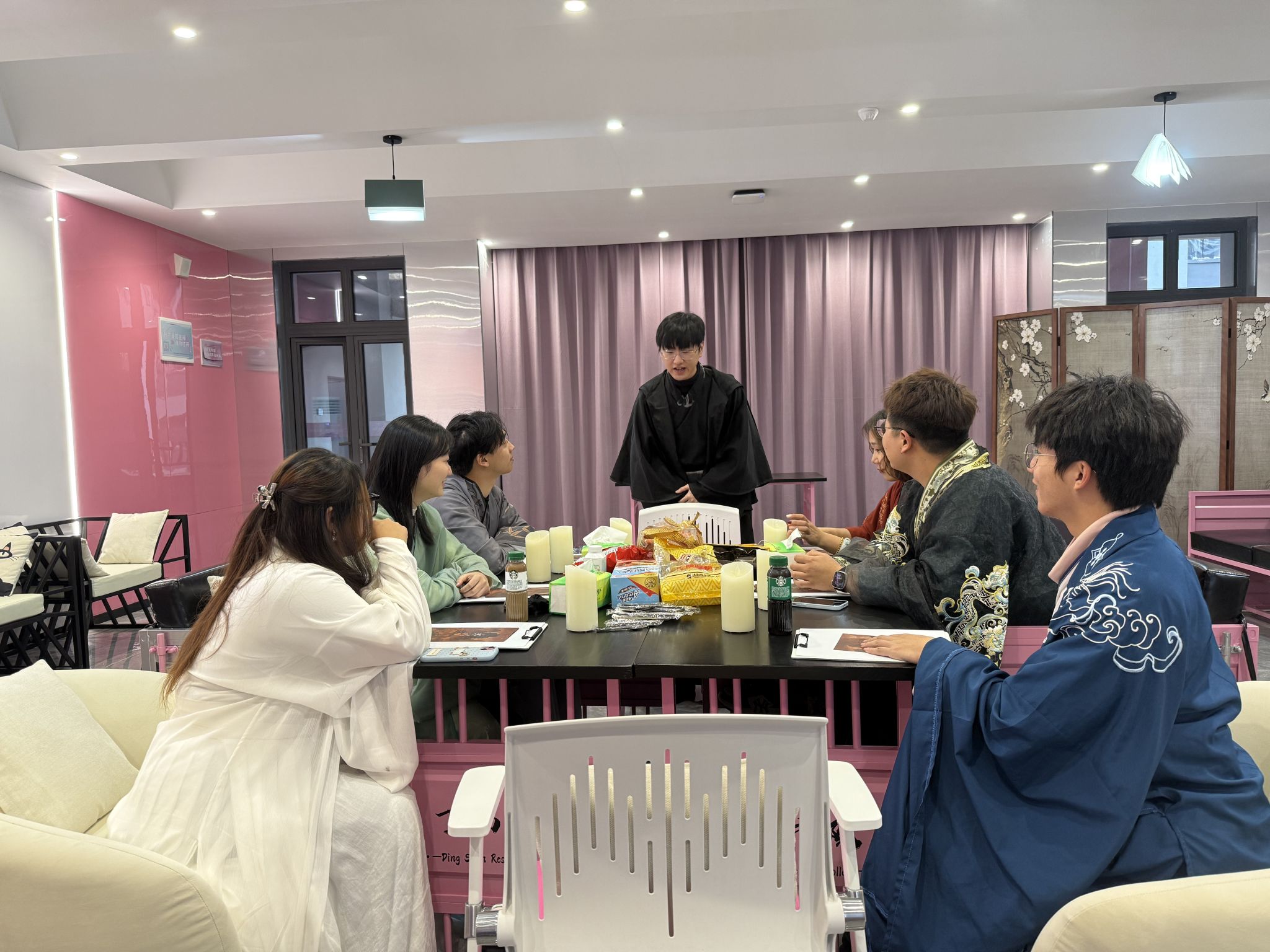 沙龙结束后,店家与师生们移步至丁山书院摩羯座·阅览空间,经过一番场地布置、性格测试、玩家换装,大型情感演绎本《寒门》揭开神秘面纱。灯光暗淡、音乐流转,师生们迅速沉浸于各自的角色之中,踏上了这场穿越时空的旅程。