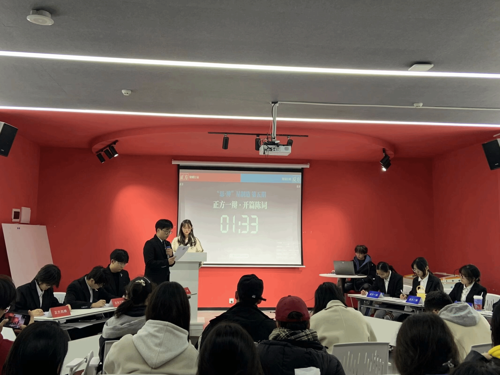 本场比赛完全按照专业赛制的流程进行,辩手们举出的例子不仅生动新颖、紧密贴合现实社会,而且极具说服力,使得辩论现场高潮迭起,精彩纷呈,不断引发观众的阵阵掌声,同时赛场上严肃紧张的气氛中,也让观摩者的同学们感受到辩论的魅力,这不仅是语言的较量,更是一场真理的探索。