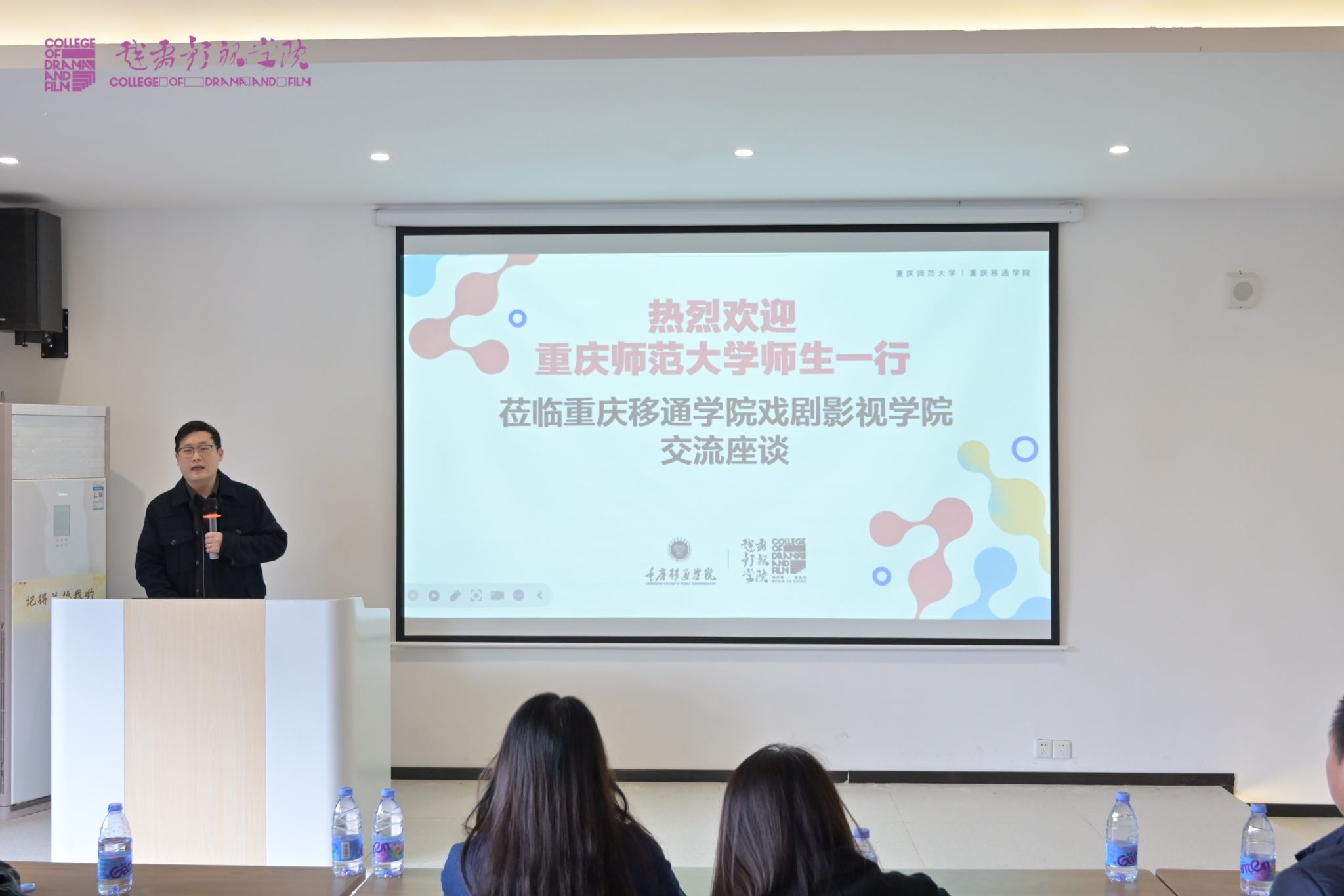 在南江书院审问·启迪思维学堂,双方师生汇聚一堂,拉开此次交流活动的序幕。杨帆老师首先代表戏剧影视学院,向重庆师范大学的师生们表达了诚挚的欢迎之情,并详细介绍了我校的发展历程、办学理念以及“四位一体双院制+特色课程”的鲜明办学特色。随后,他围绕学院以工科为基、艺术为魂、商科为翼的特色模式,深入阐述了学院在专业建设、学科建设及人才培养模式上的探索与实践。戏剧影视学院始终秉持应用型导向,积极响应学校“立志成为双一流之外的首选大学”的品牌价值追求,致力于构建一体化、全链式的人才培养流程,精心培育具备强大实践能力的戏剧影视专业人才。