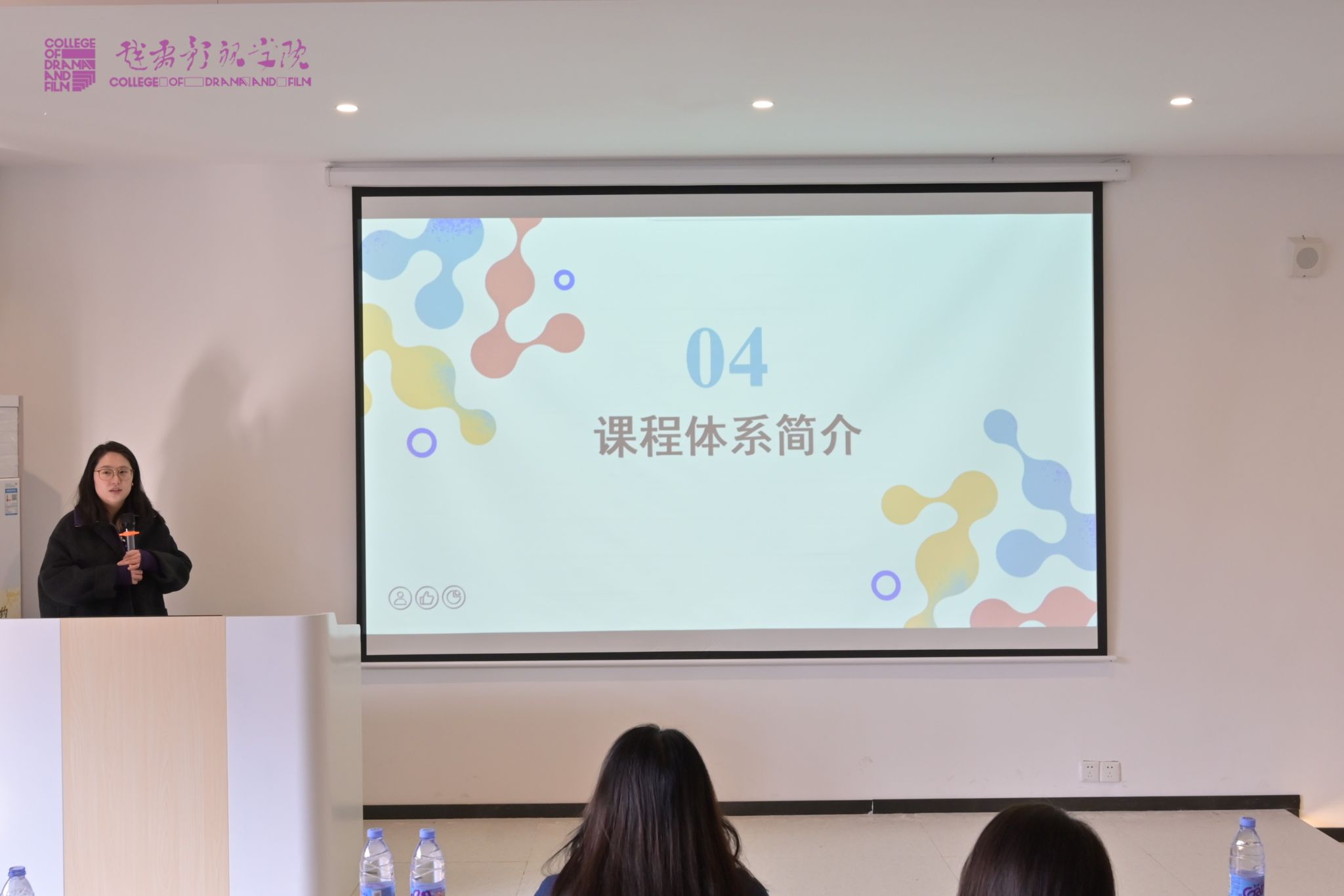 紧接着,戏剧影视文学专业负责人郭嘉琦老师,就此次交流活动的核心议题——戏剧影视文学专业建设,进行了全面而深入的讲解。她指出,该专业建设立足智能媒体时代,紧贴数字影像时代发展脉搏,致力于培养符合时代需求、行业期待的复合型应用型人才。学院积极构建以专业基础课、专业核心课、拓展课程为一体的课程体系结构,专业课程进一步细化为专业理论课与实践课,搭建起坚实的专业知识体系。在技术革新与专业转型的背景下,该专业正积极探索转型发展方向,并结合学校办学特色与育人模式,开发影视批评、摄影摄像等多维度专业技能课程,为学生的多样化成长提供有力支撑。